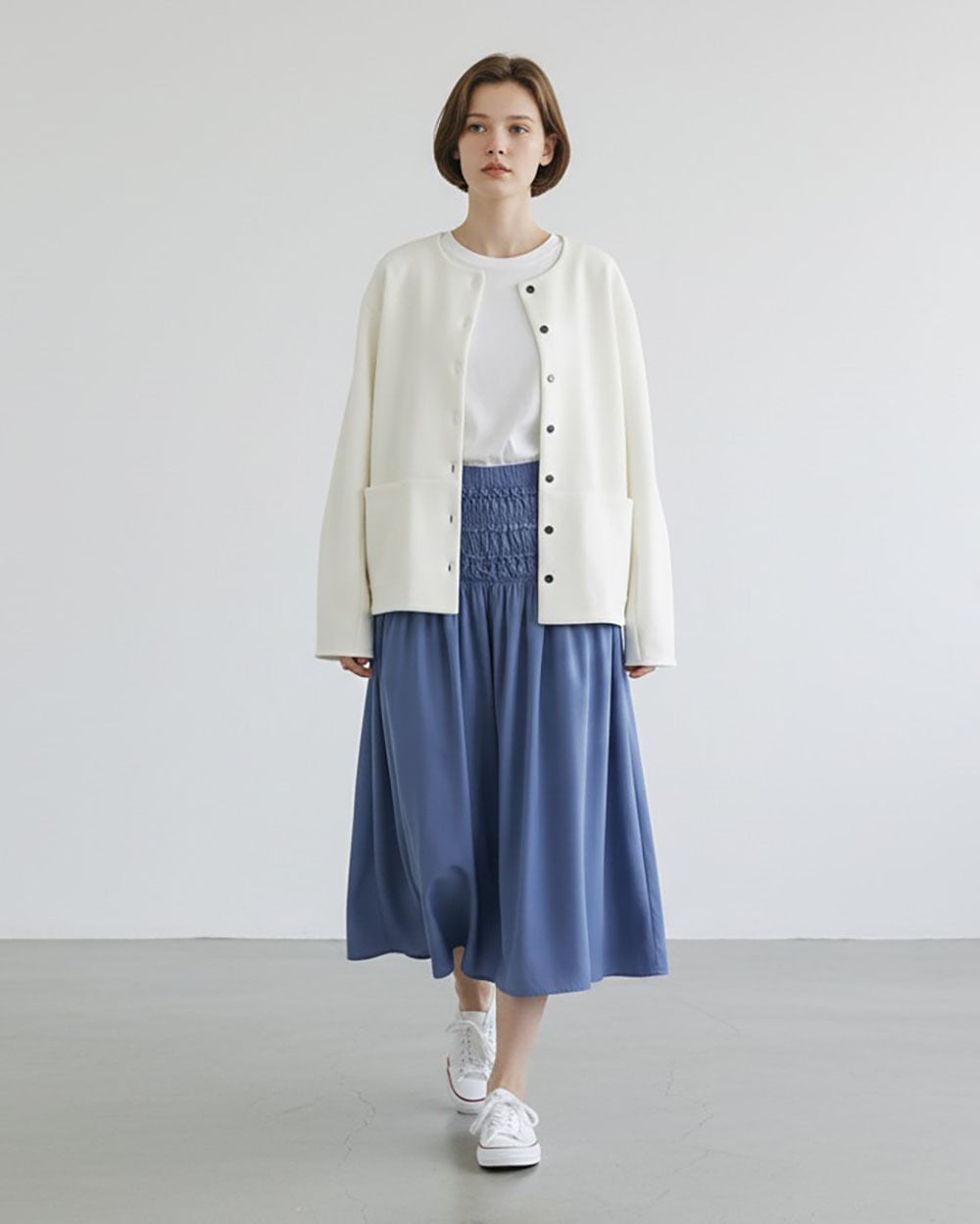 ふんわりとしたフォルムが女性らしい柔らかさを引き立て、体のラインをさりげなくカバーします。
