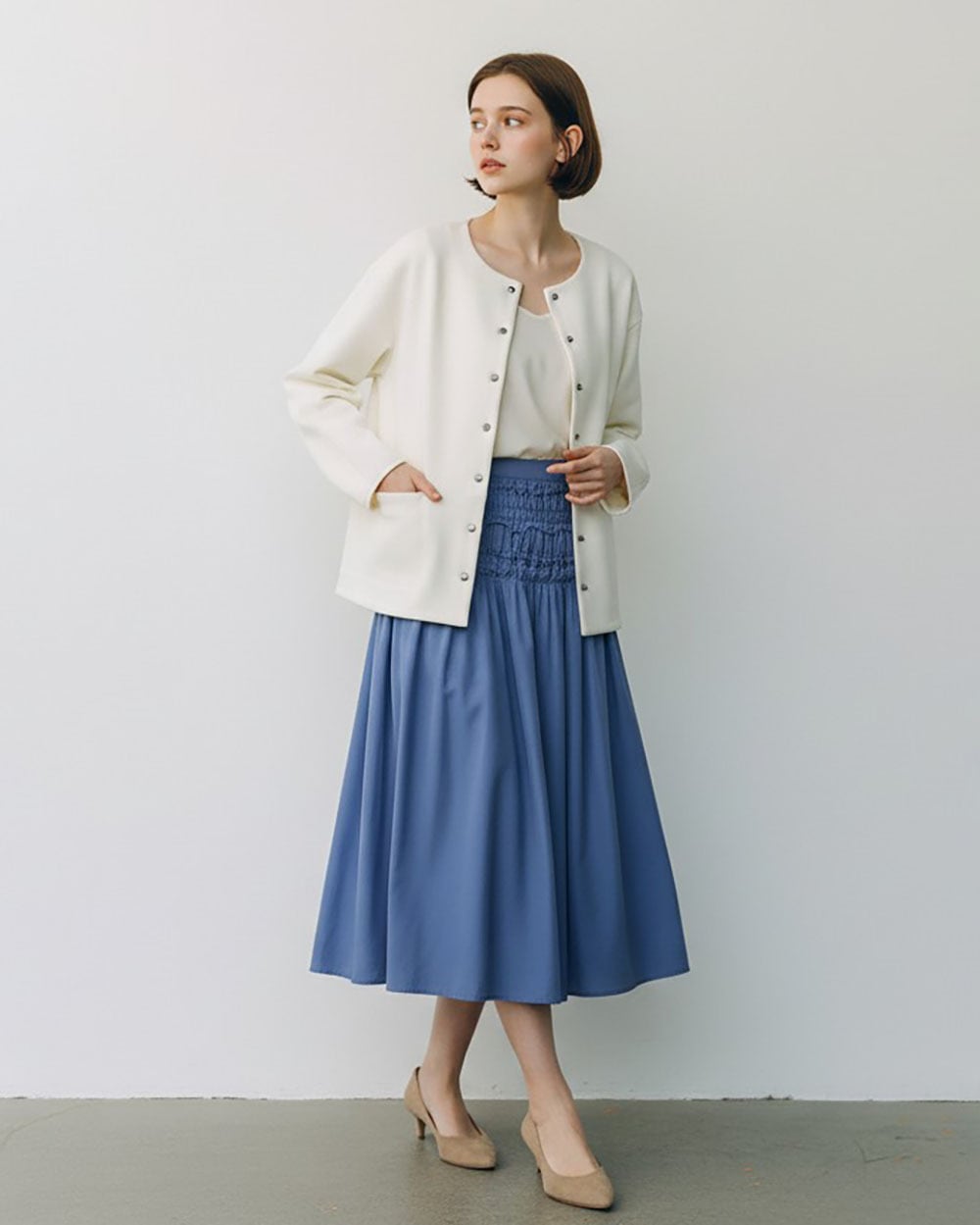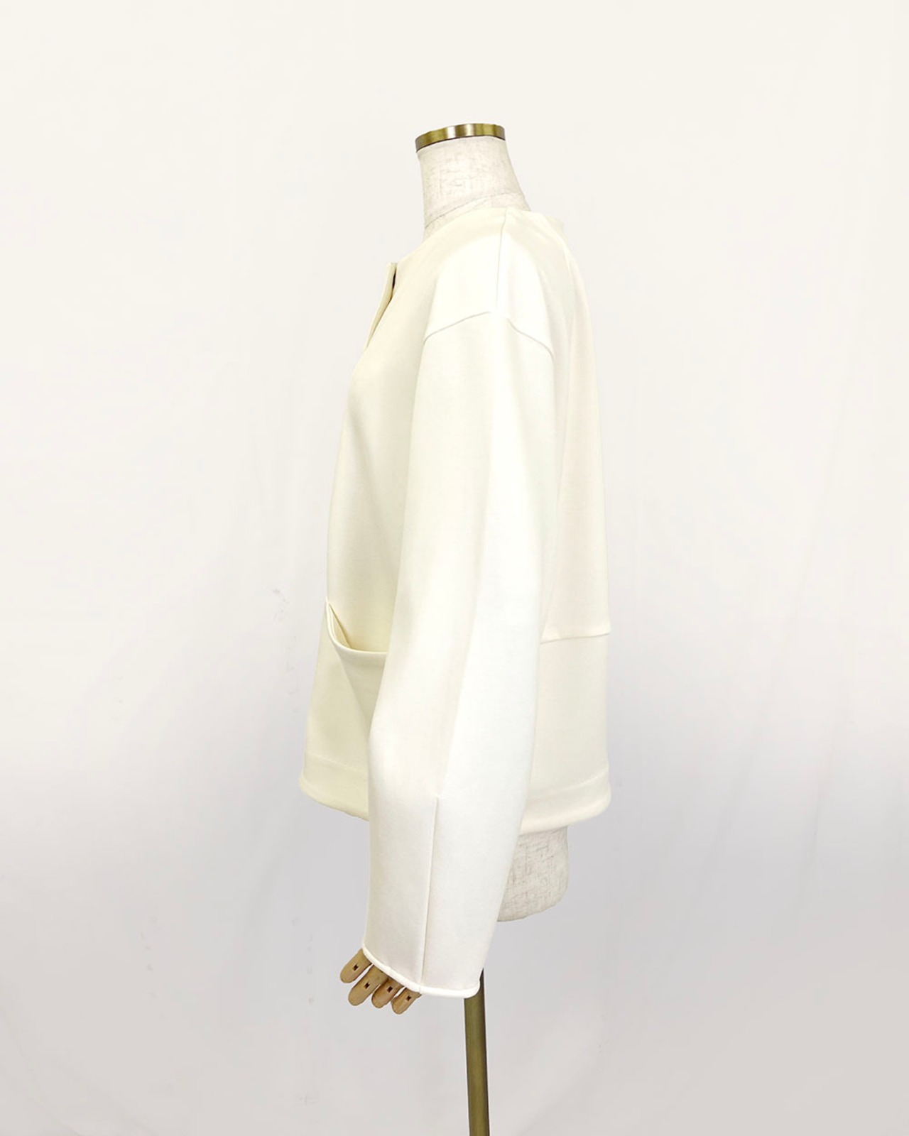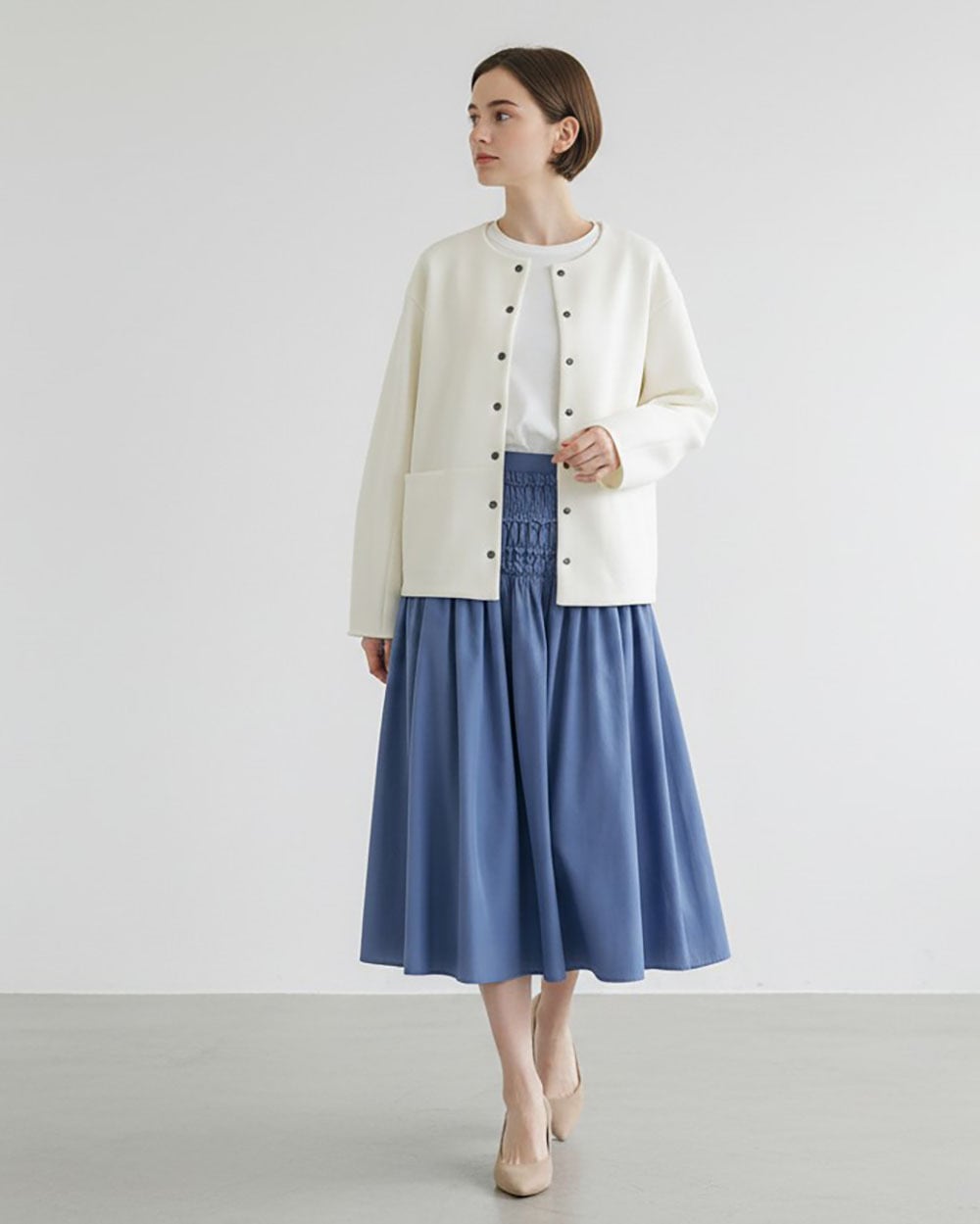 ほどよいハリ感と柔らかな風合いが特徴で、軽やかな着心地ながらもきちんと見えする一枚です。