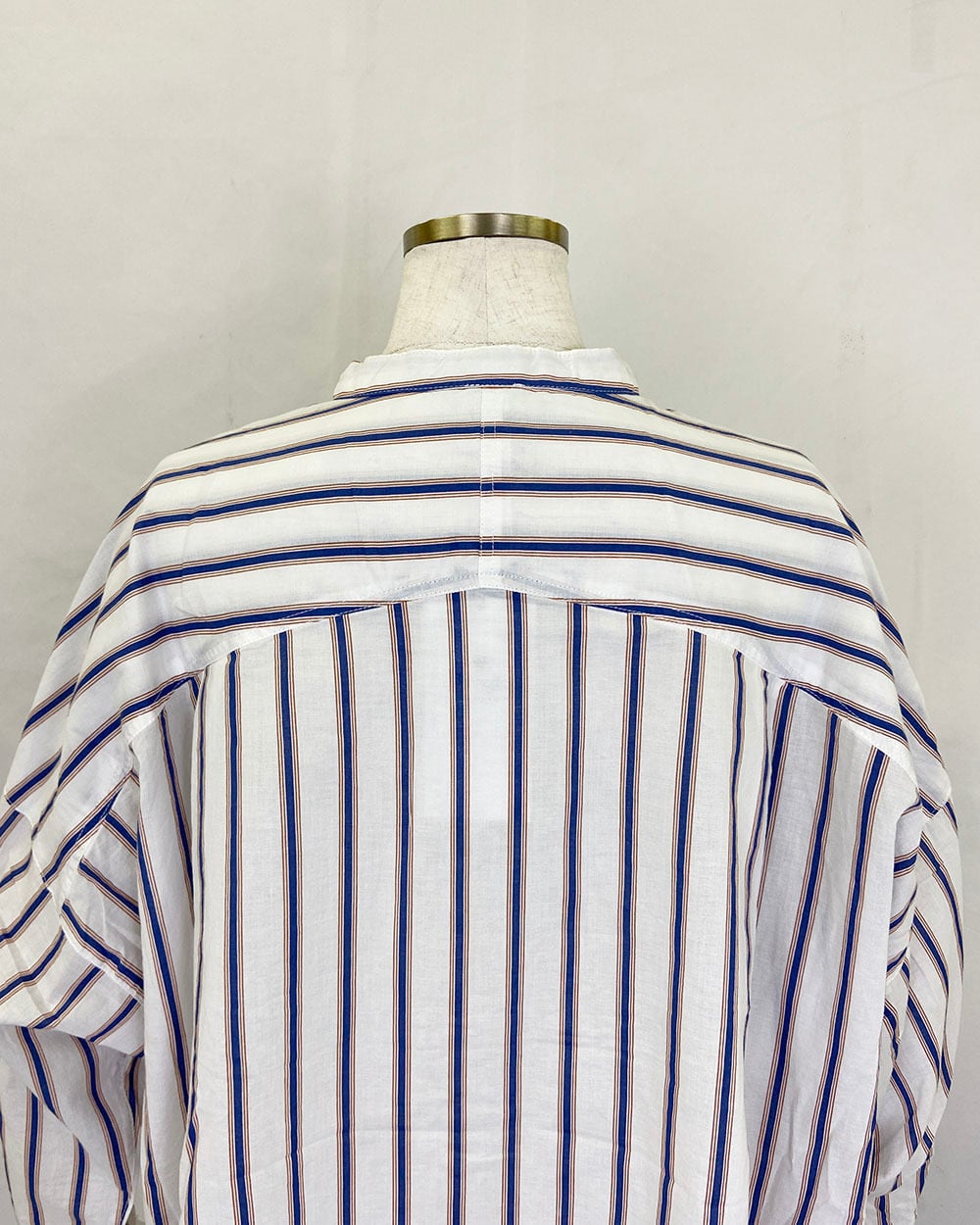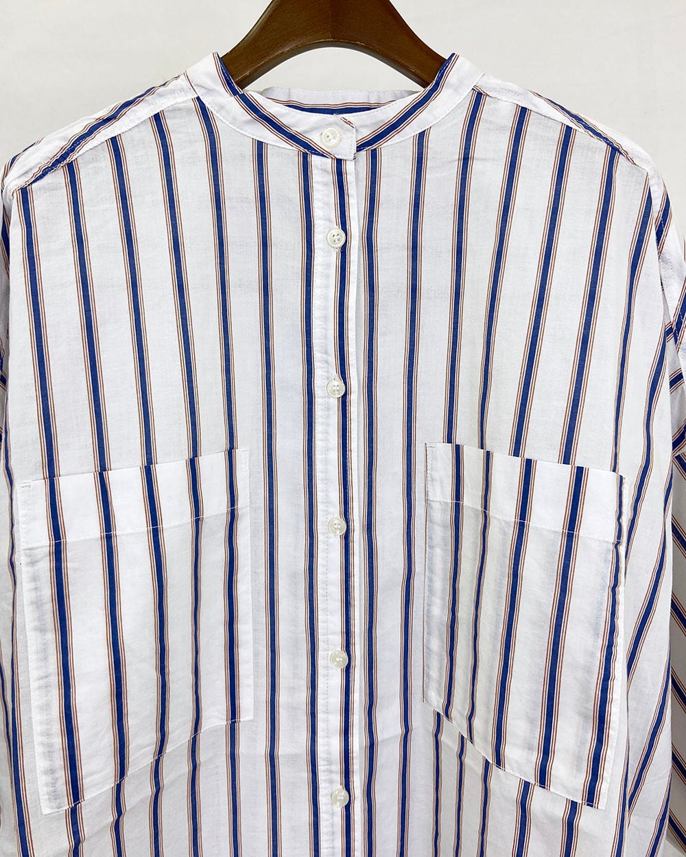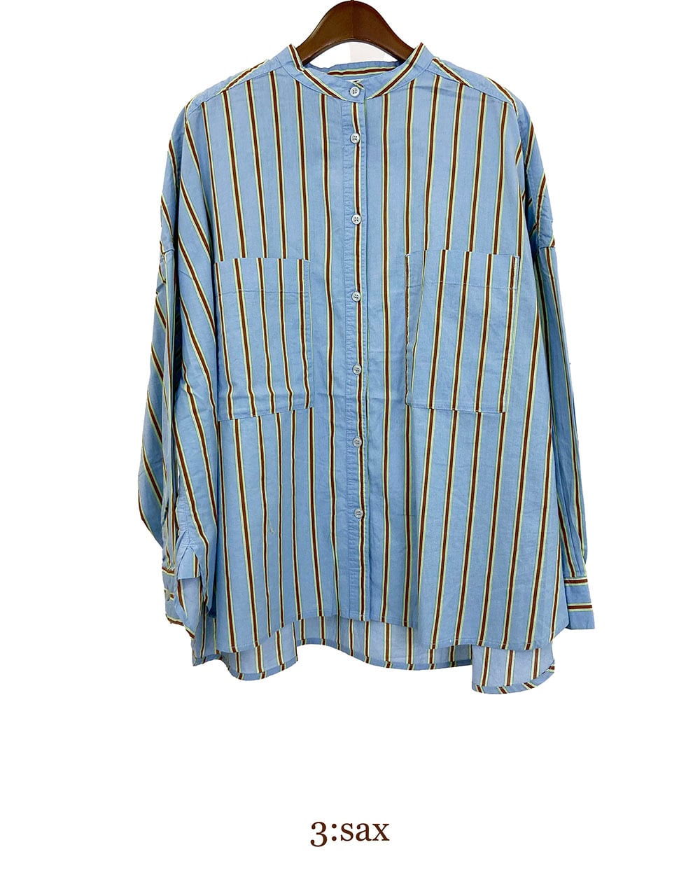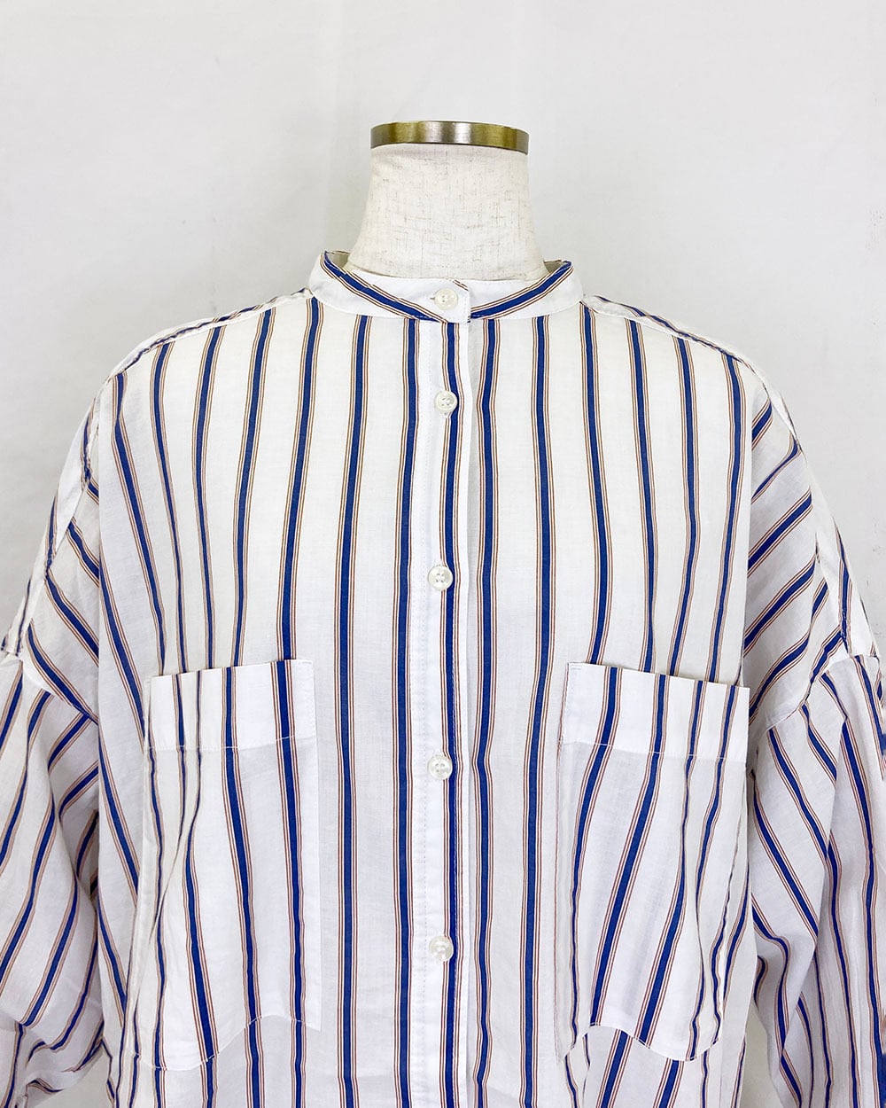 コットン100%のさらりとした肌触りが心地よい、バンドカラーマルチストライプシャツ。