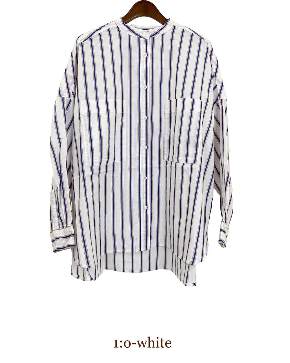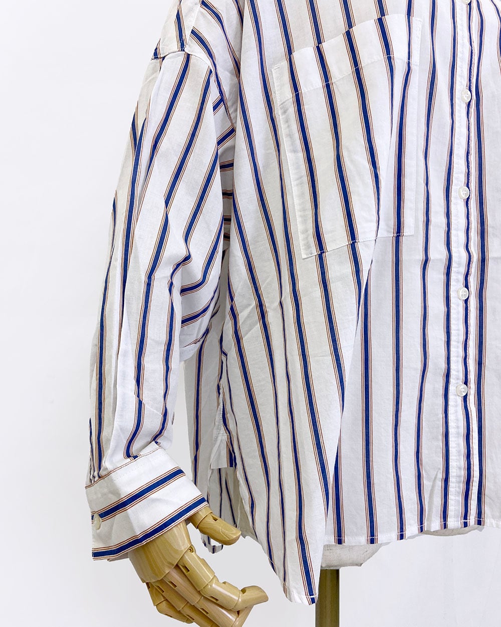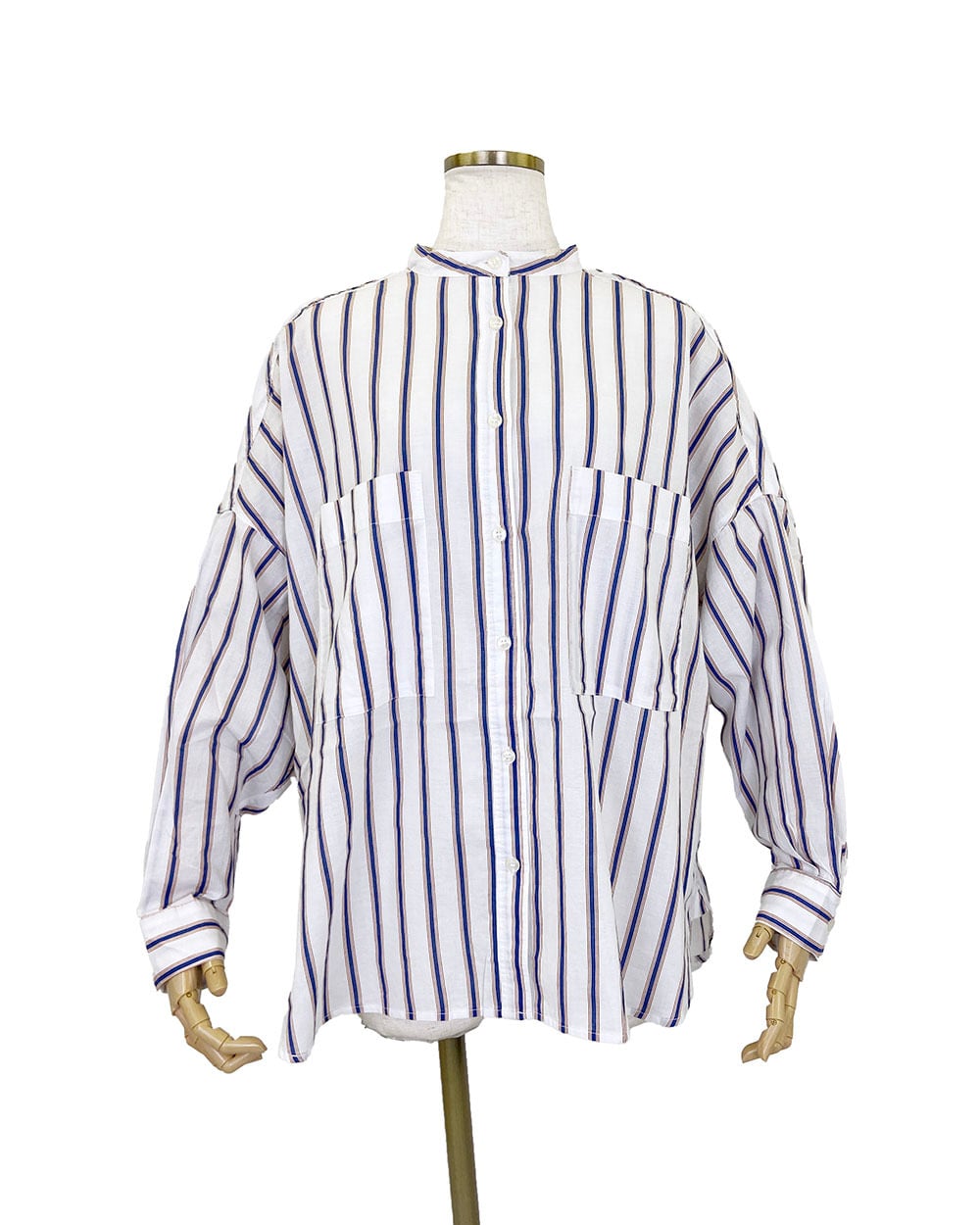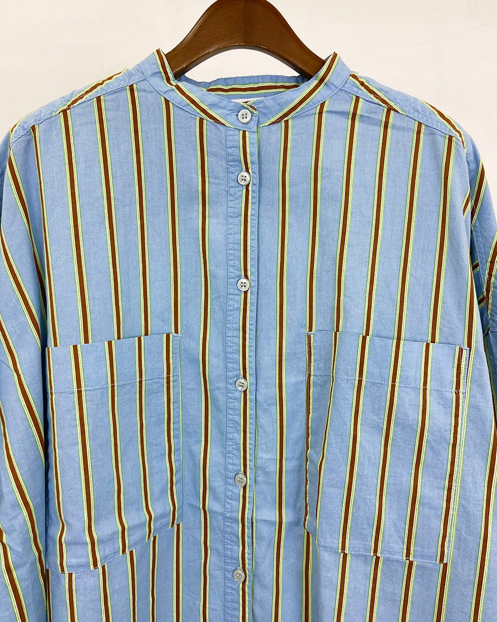コットン100%のさらりとした肌触りが心地よい、バンドカラーマルチストライプシャツ。
