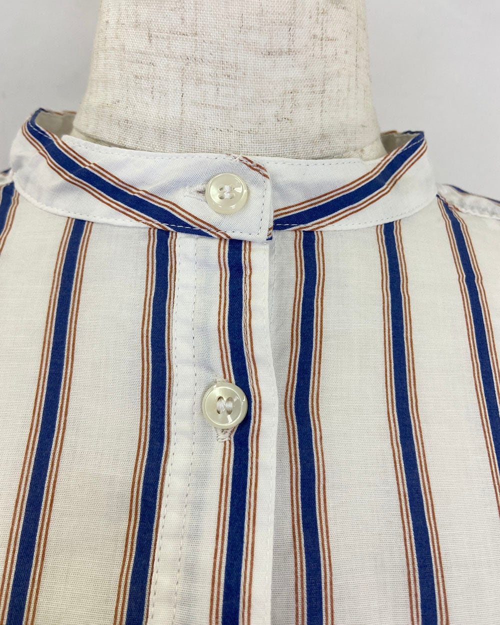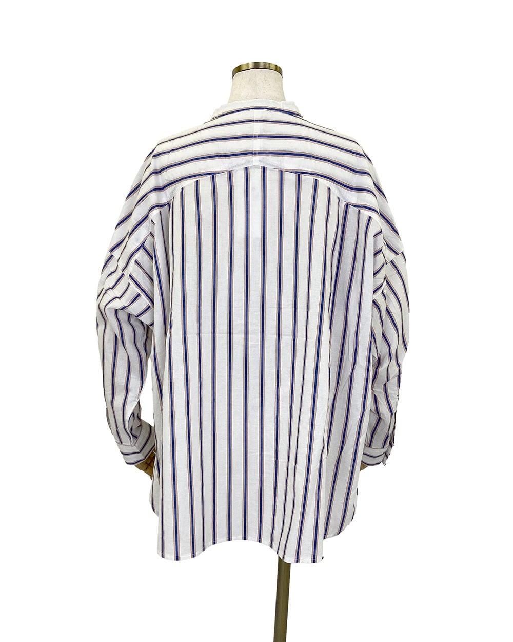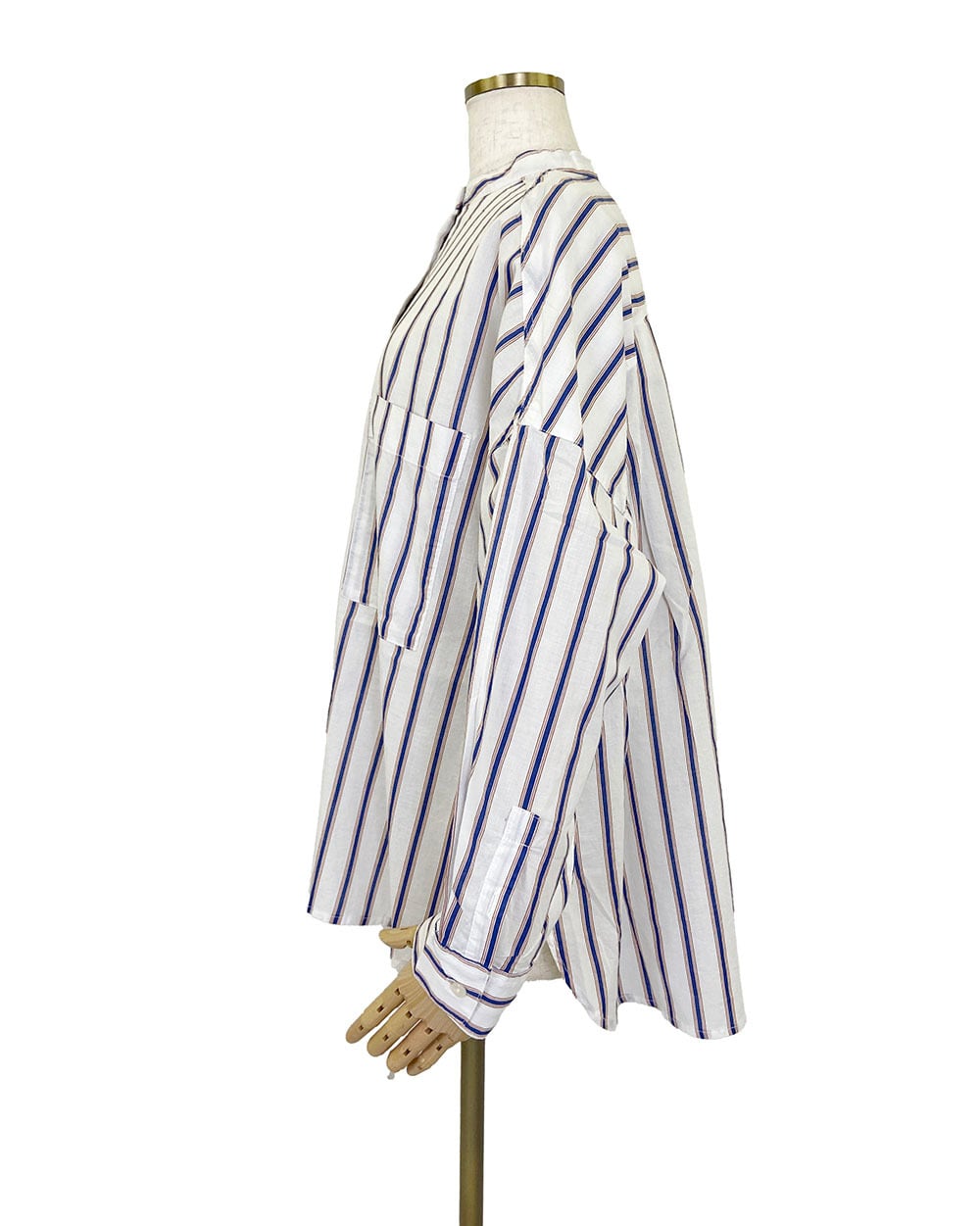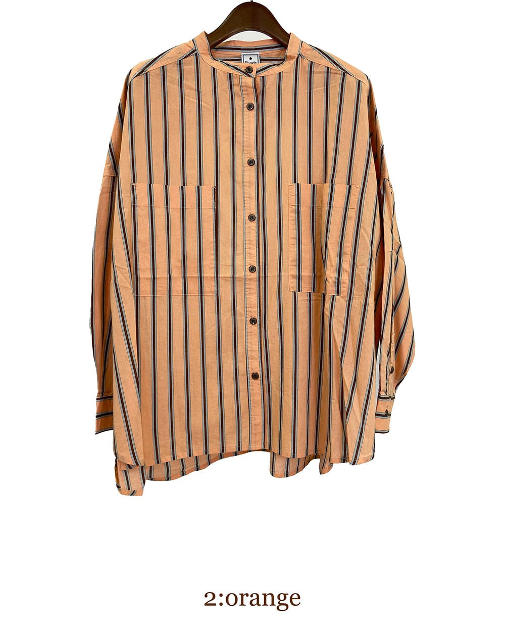コットン100%のさらりとした肌触りが心地よい、バンドカラーマルチストライプシャツ。