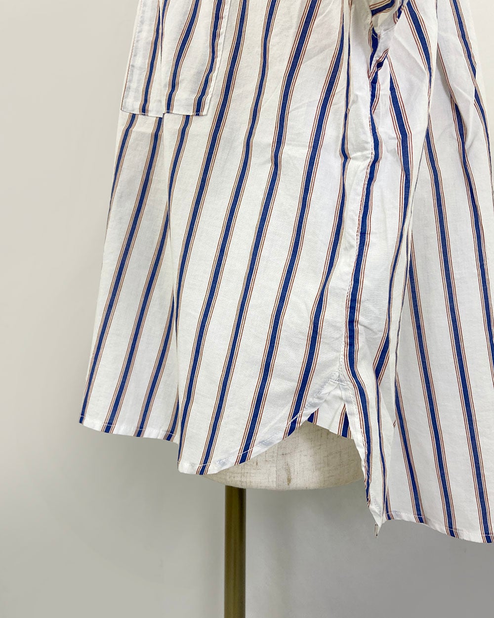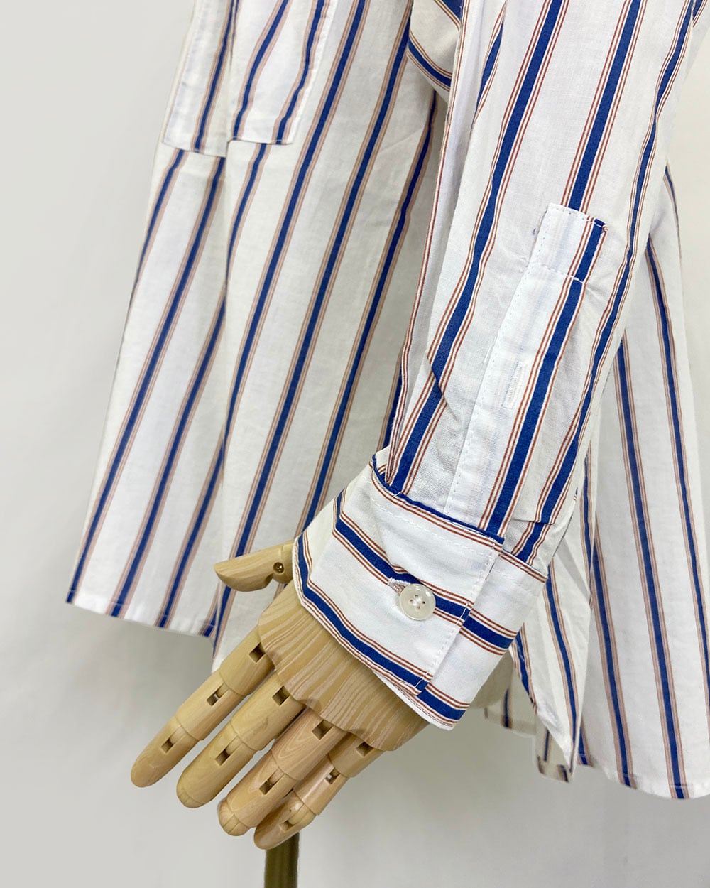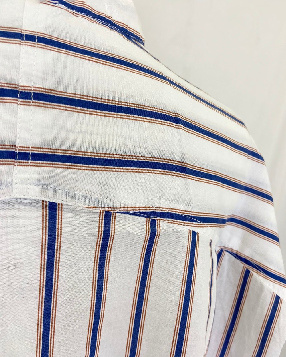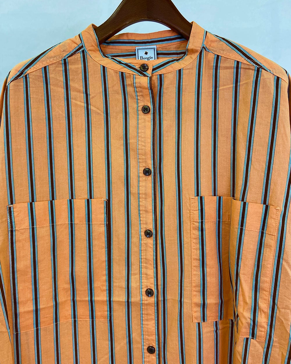 コットン100%のさらりとした肌触りが心地よい、バンドカラーマルチストライプシャツ。