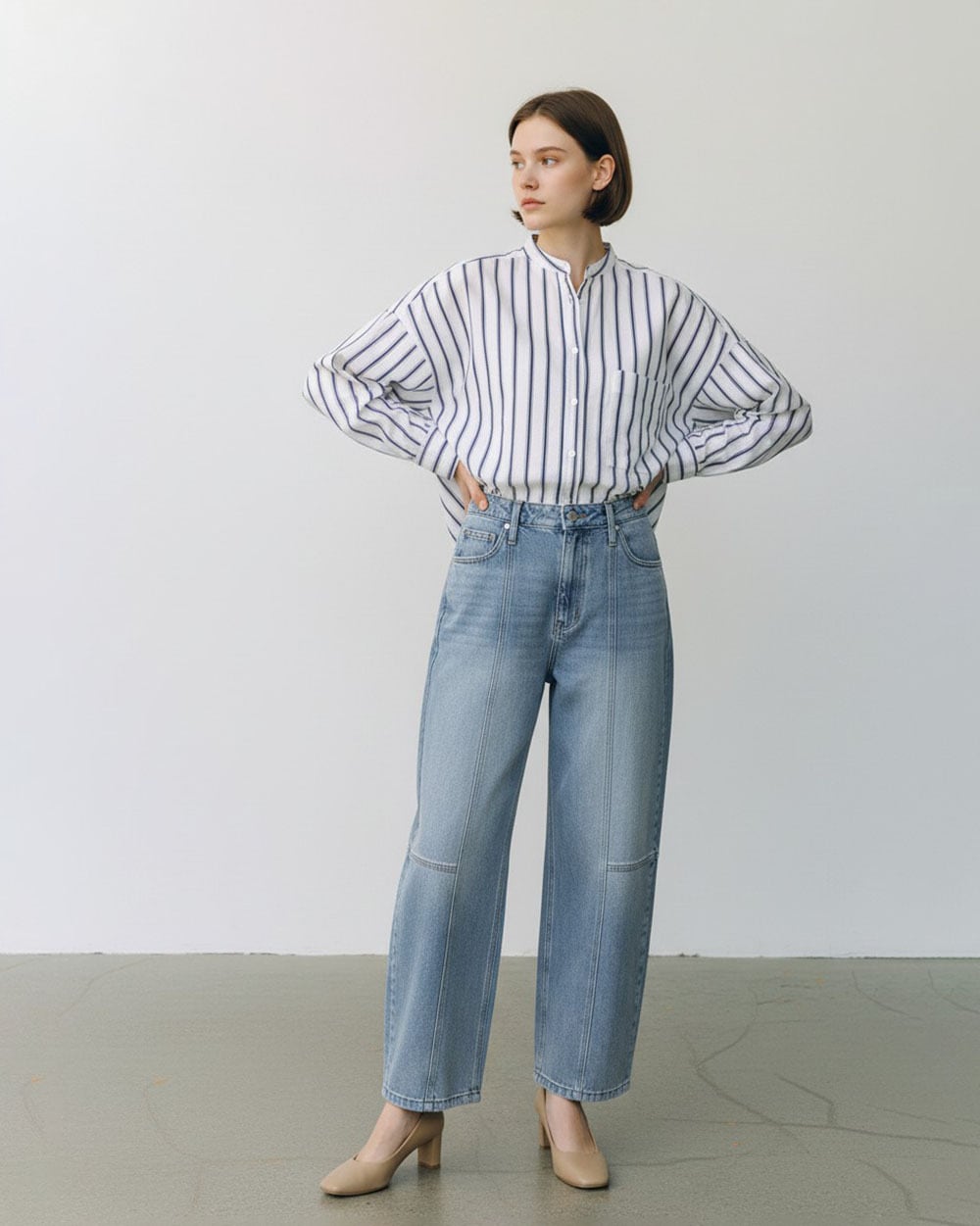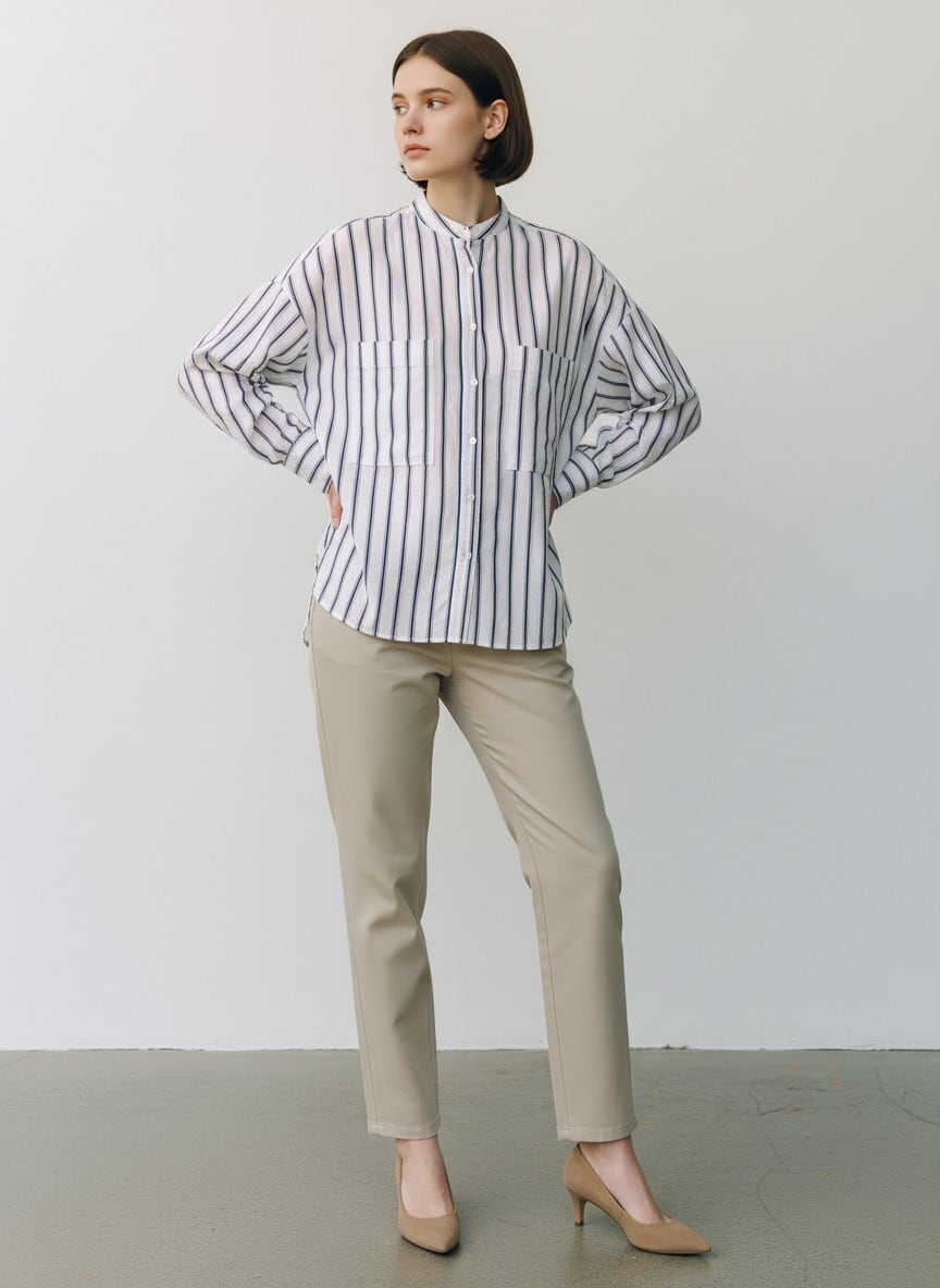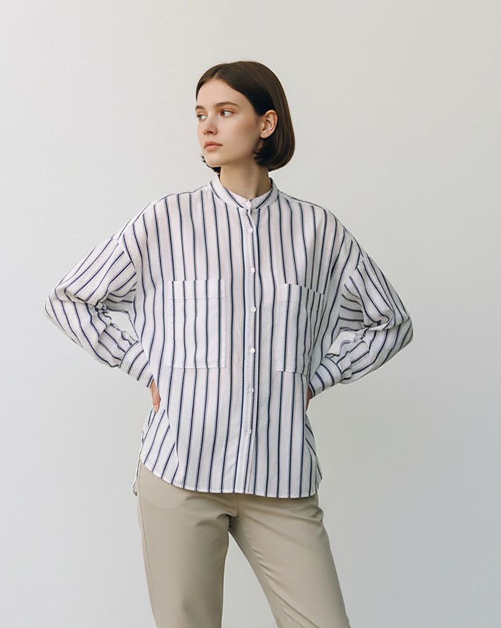 すっきりとしたバンドカラーが首元を上品に見せ、程よい抜け感を演出。