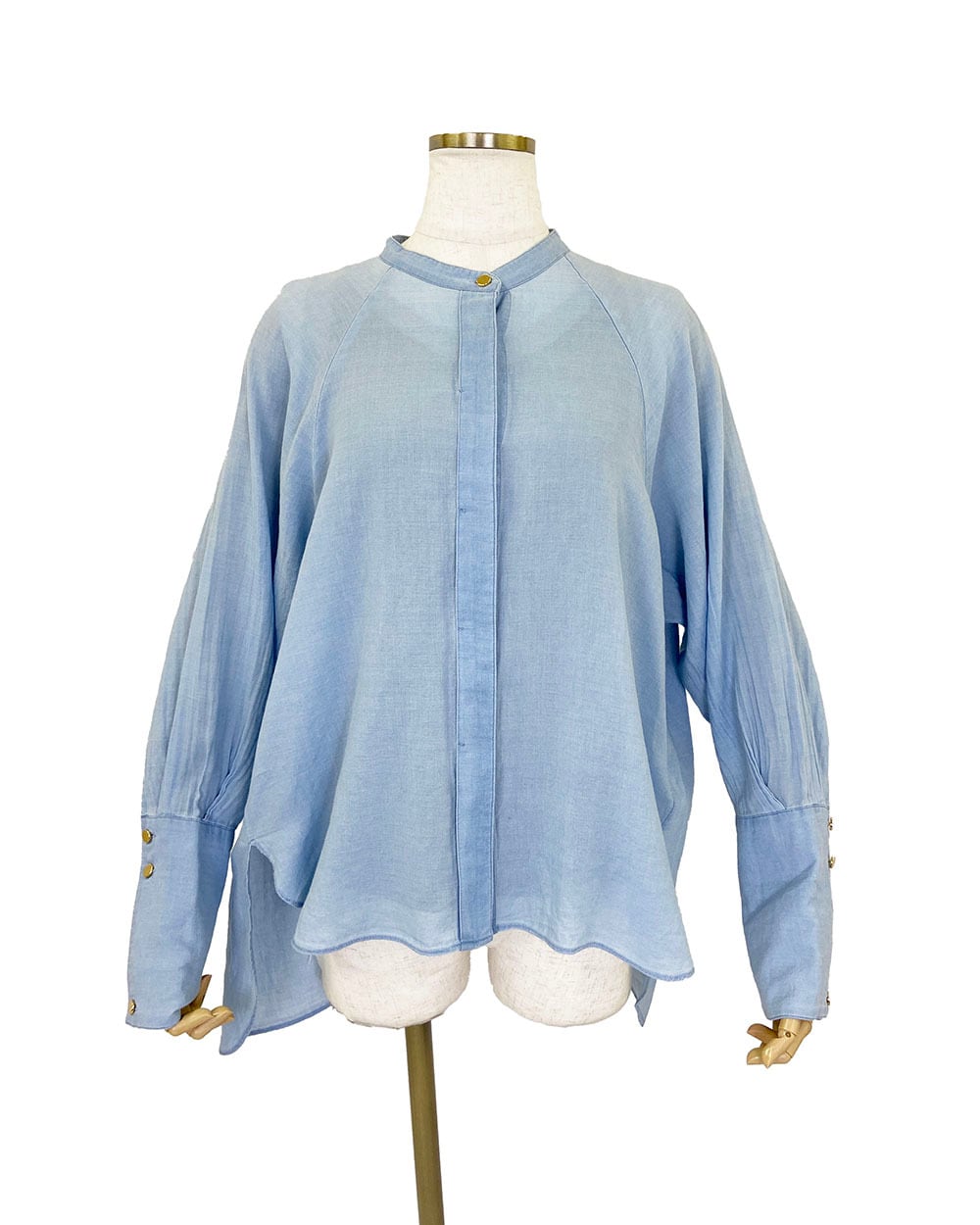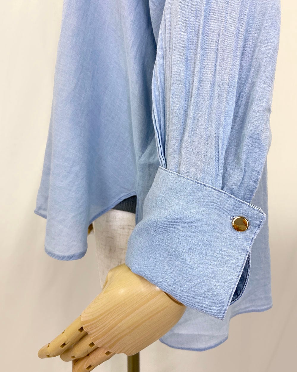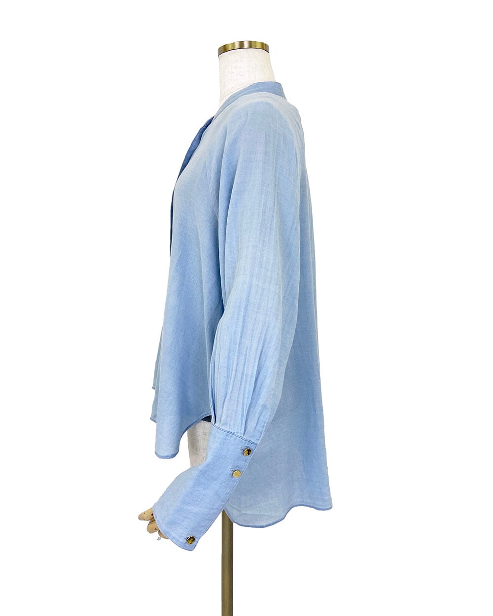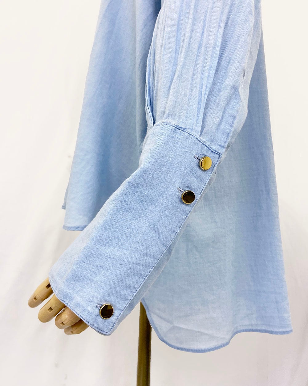 ロングカフスとメタルボタンがデザインのポイントとなり、カジュアルすぎず上品な雰囲気を演出します。