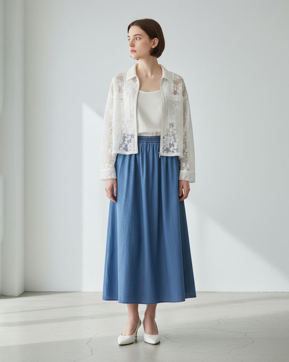 ・マキシスカートに合わせて、軽やかなフェミニンスタイルに。
