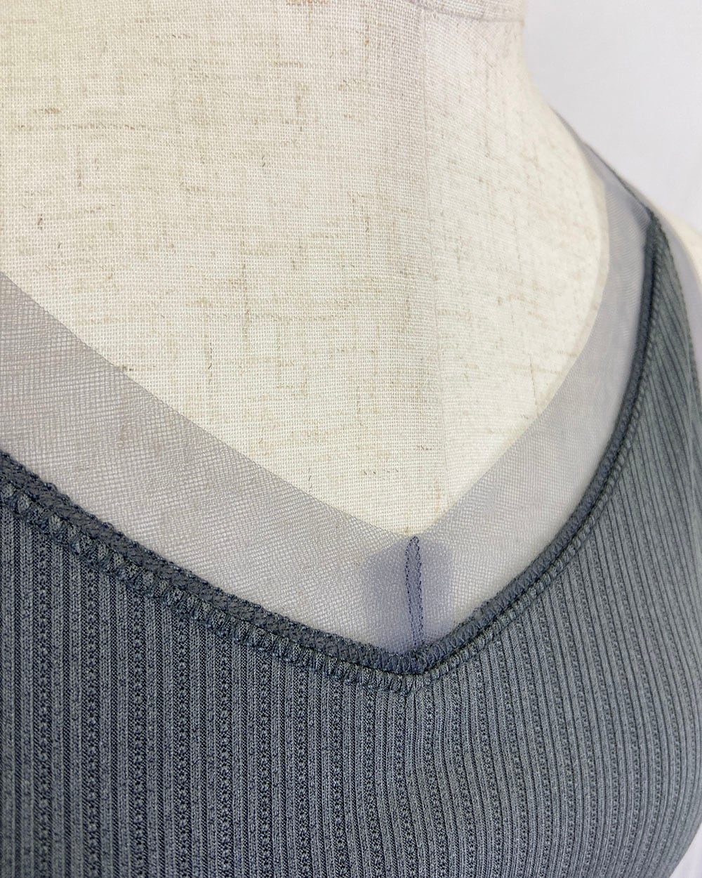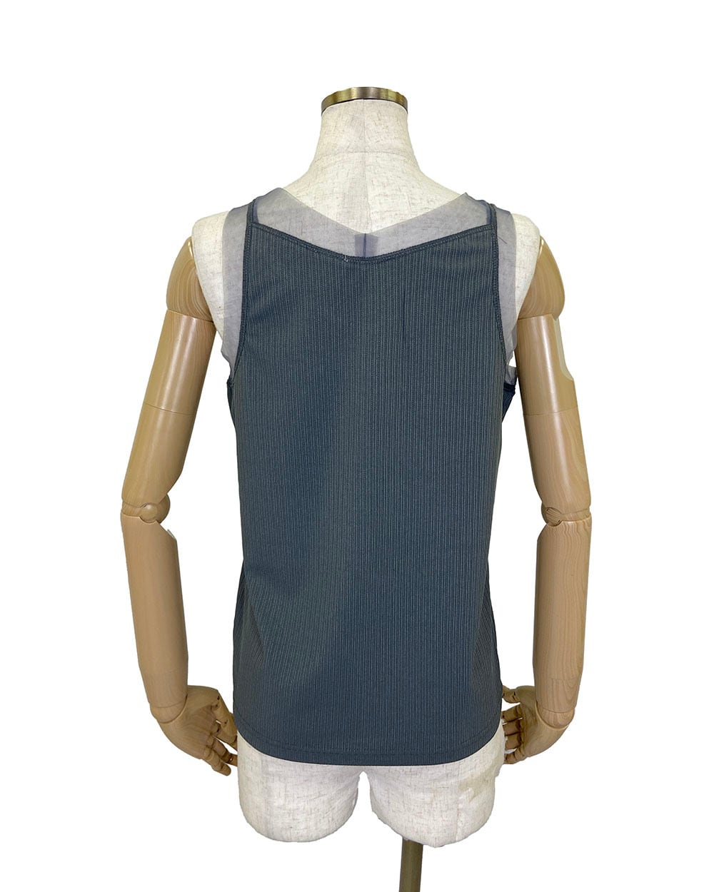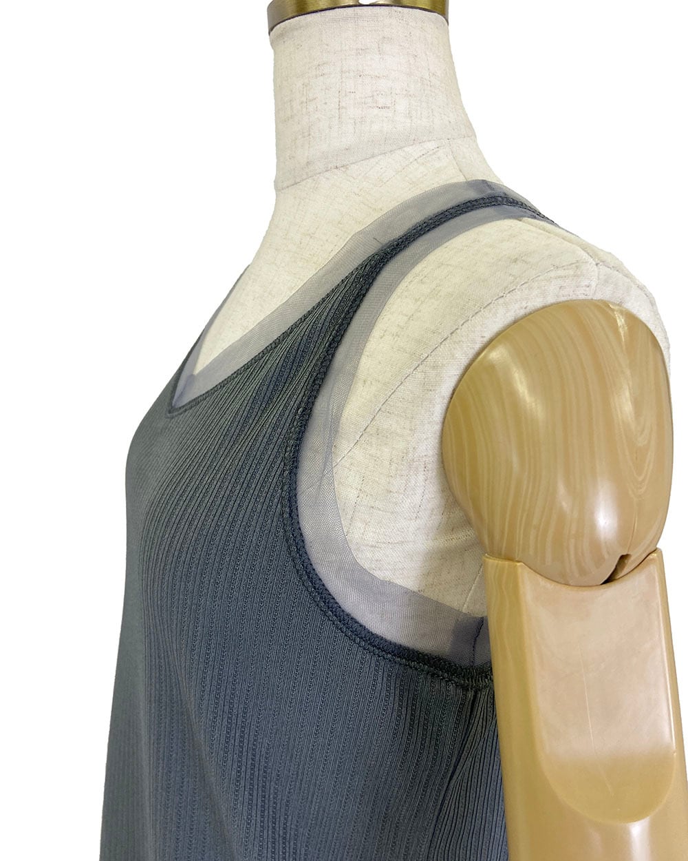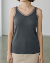 えりぐりとアームホールに同系色のチュール生地を切り替えた、上品な印象のタンクトップ。