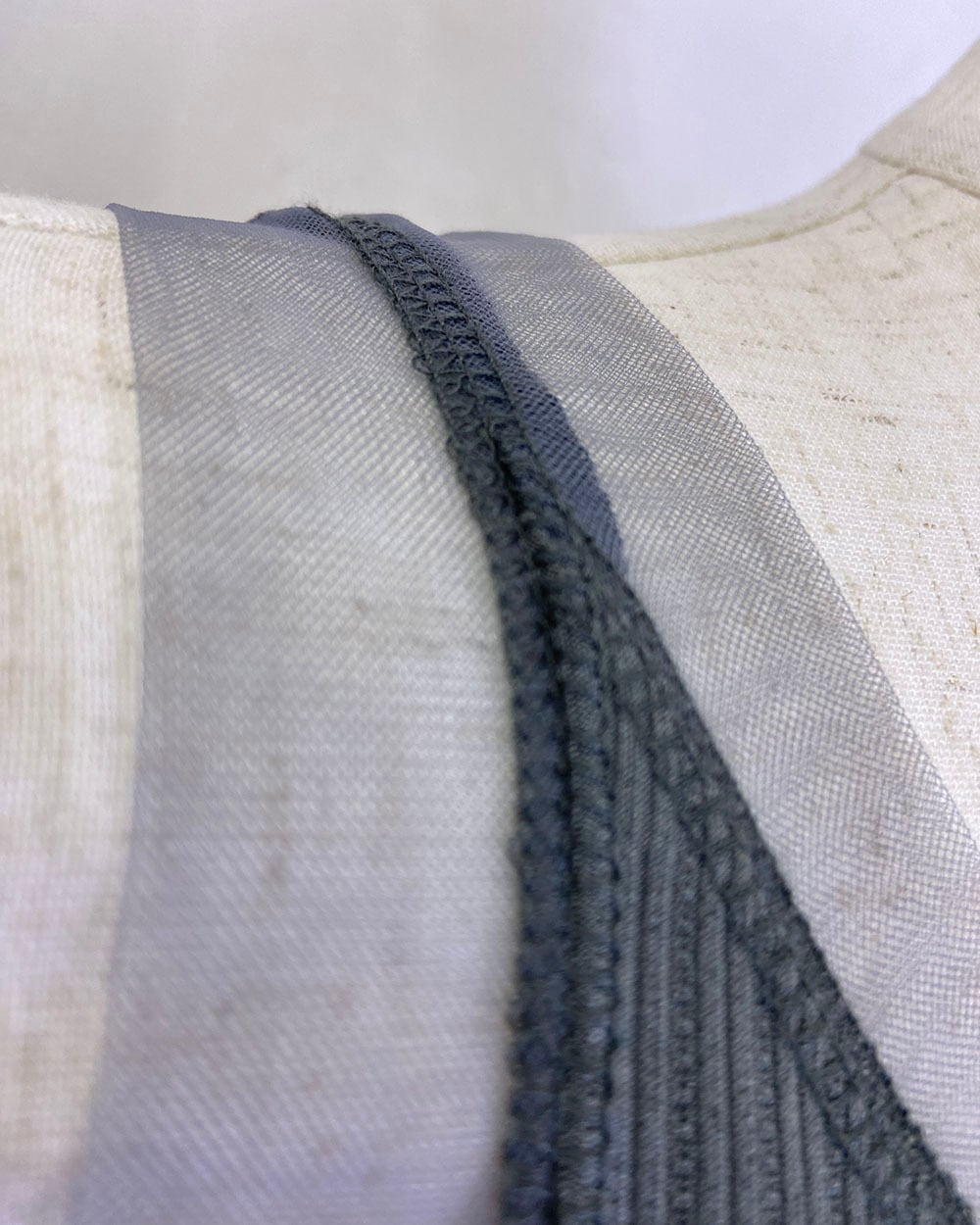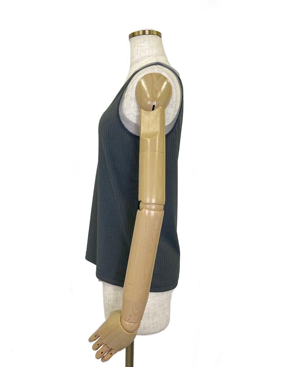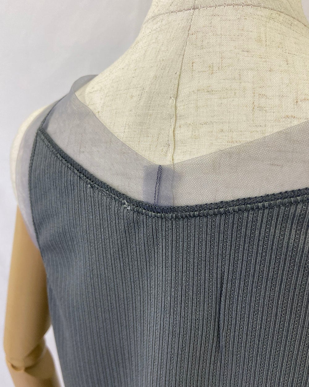 えりぐりとアームホールに同系色のチュール生地を切り替えた、上品な印象のタンクトップ。