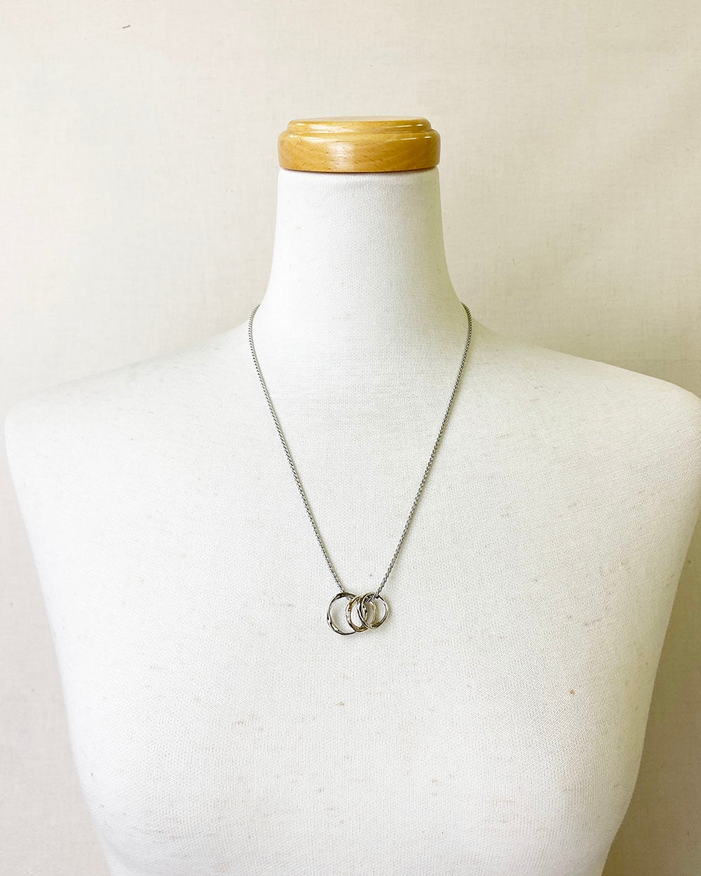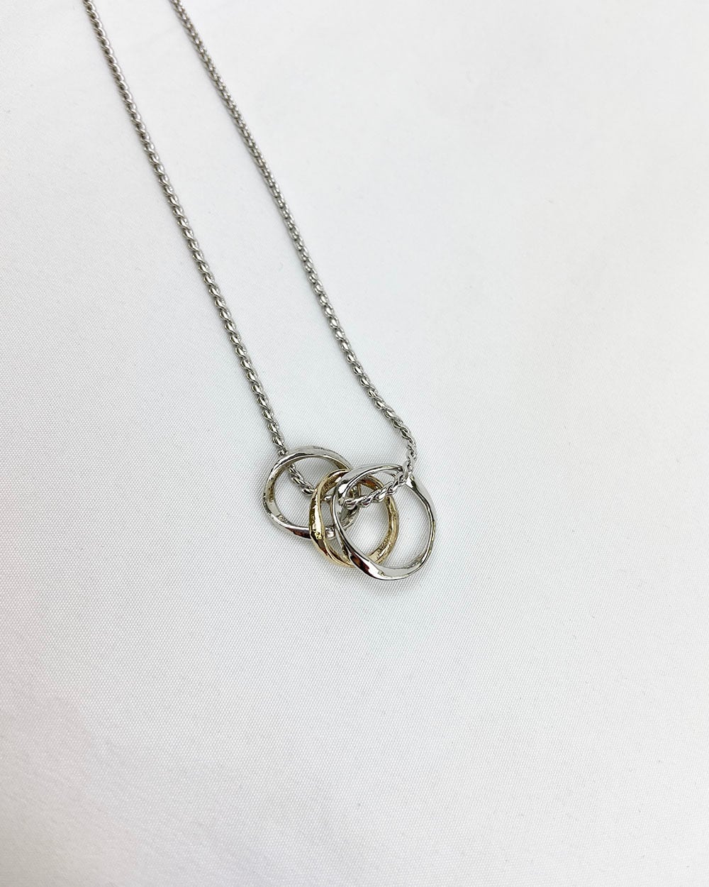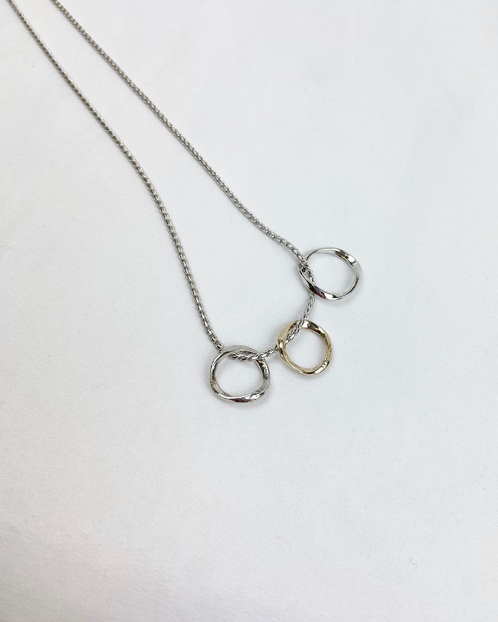 捻りを加えた大小のリングパーツを3連に連ねた、存在感のあるネックレス。