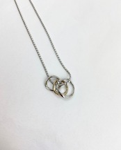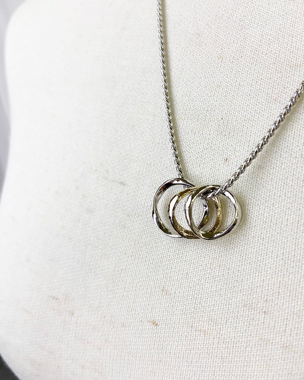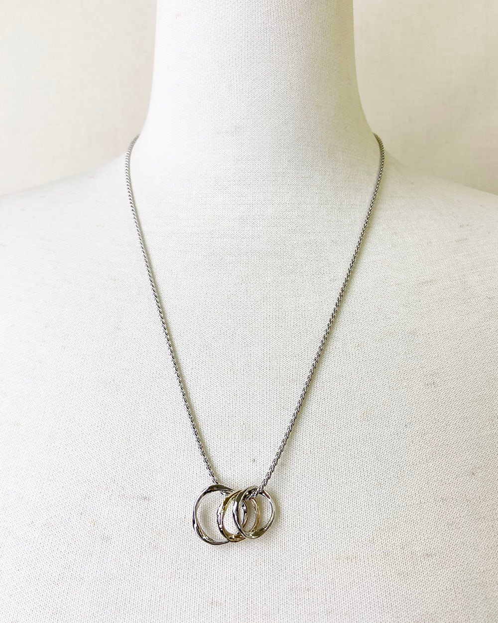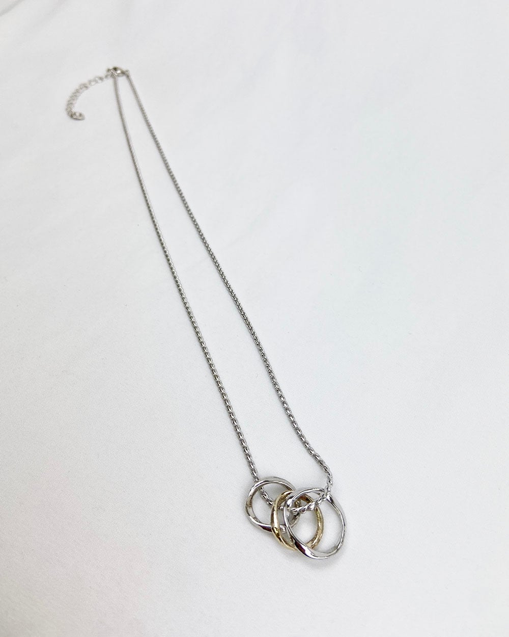 捻りを加えた大小のリングパーツを3連に連ねた、存在感のあるネックレス。