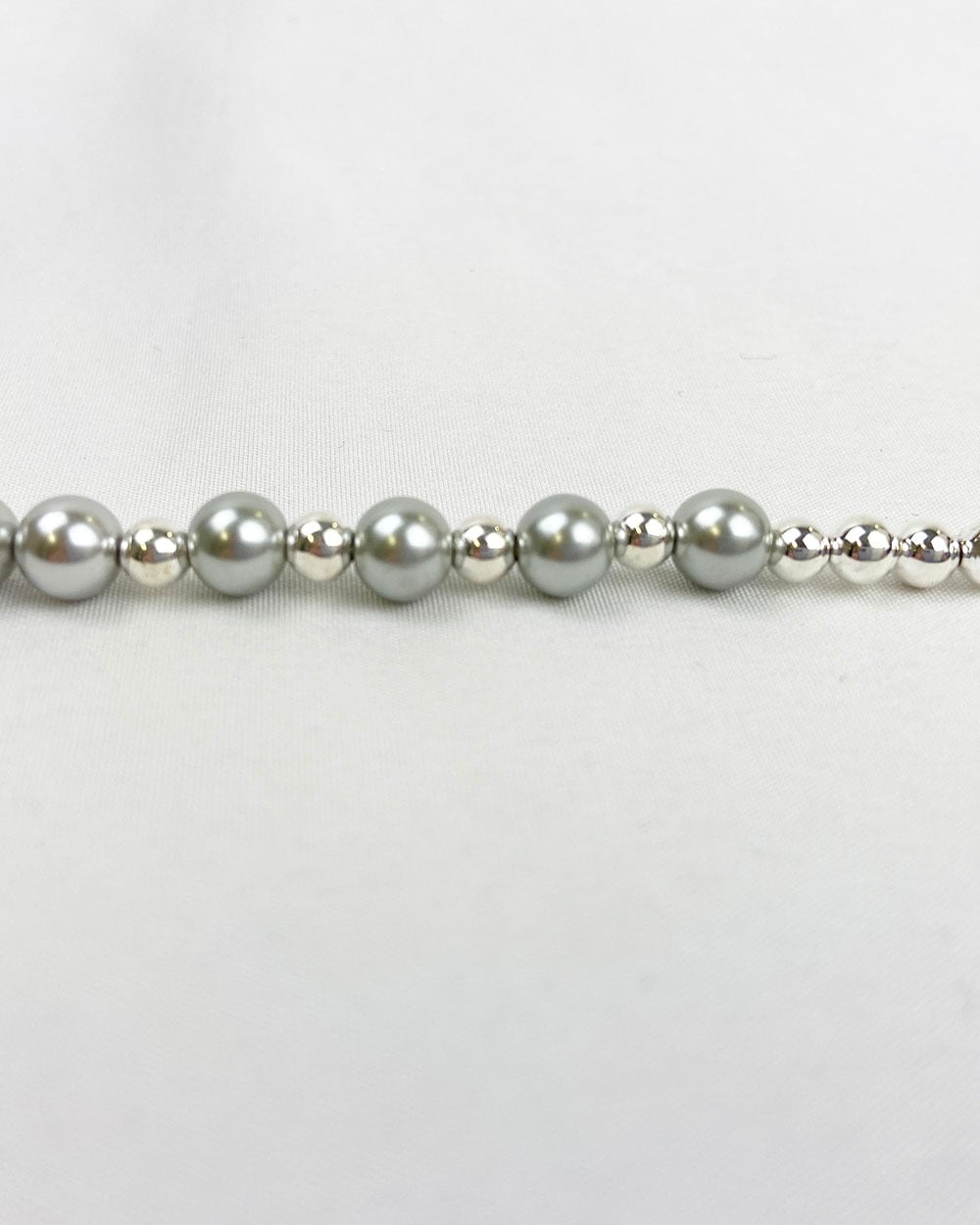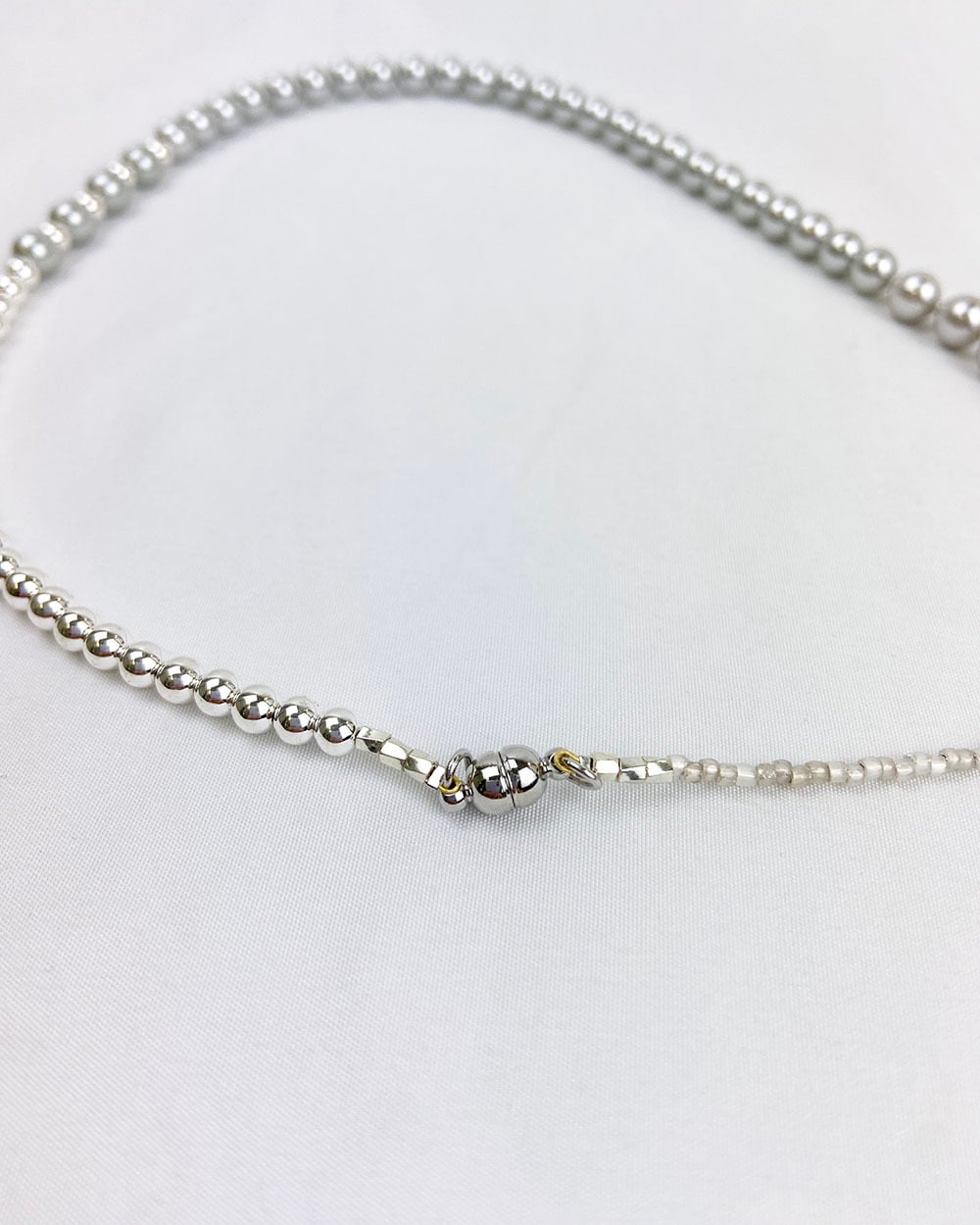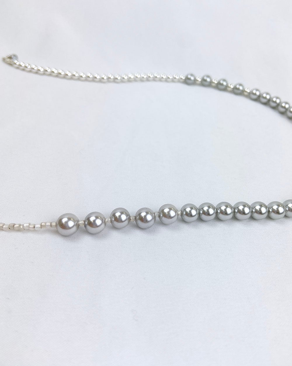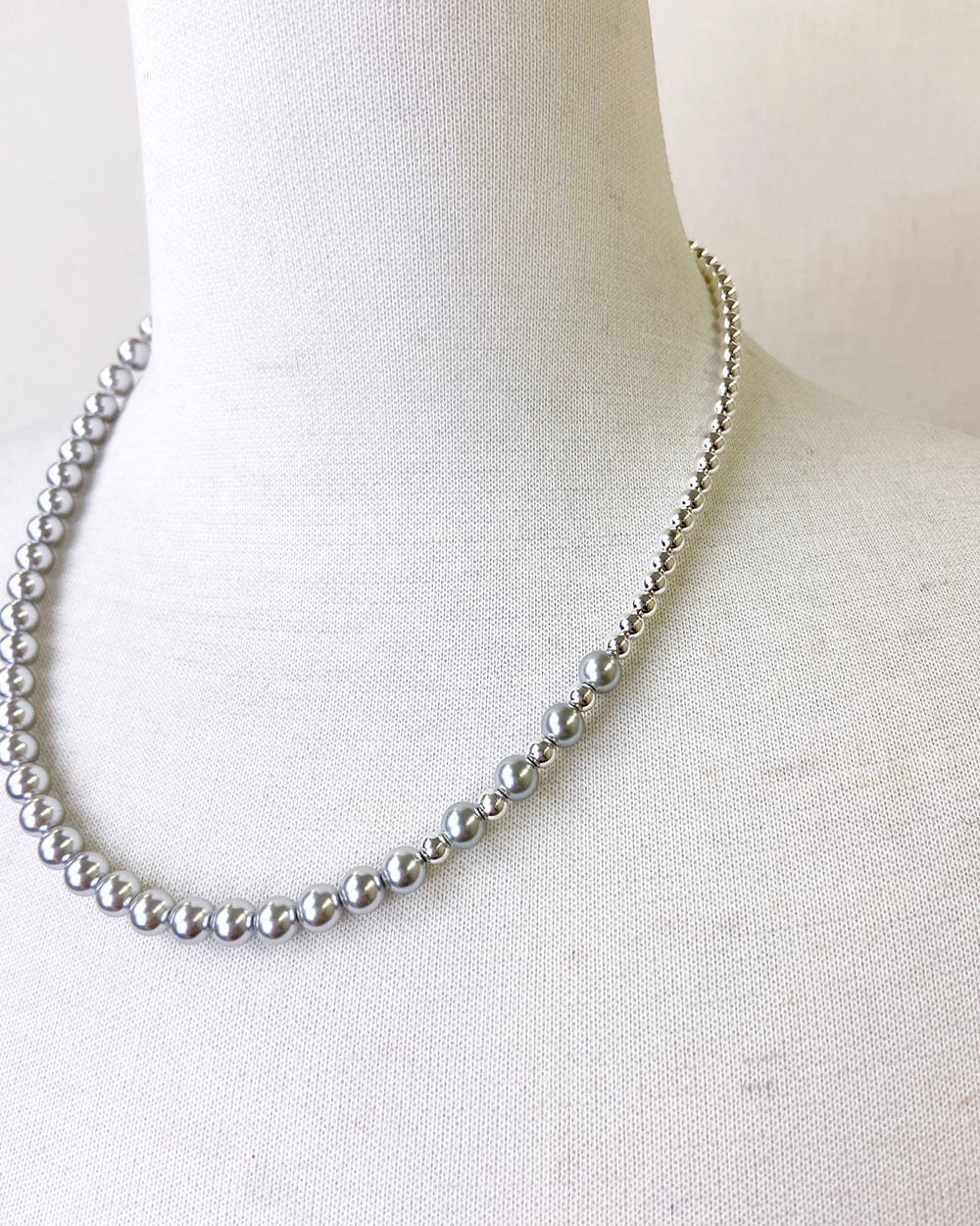 シルバーとグレーのトーンが織りなす静かな光沢が、首元にモダンなニュアンスを添えます。