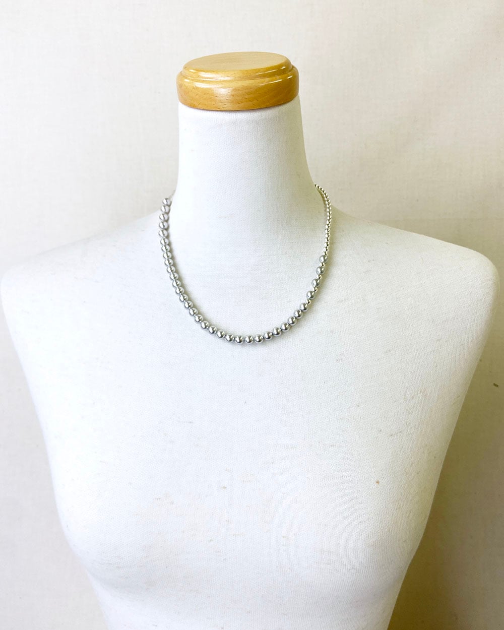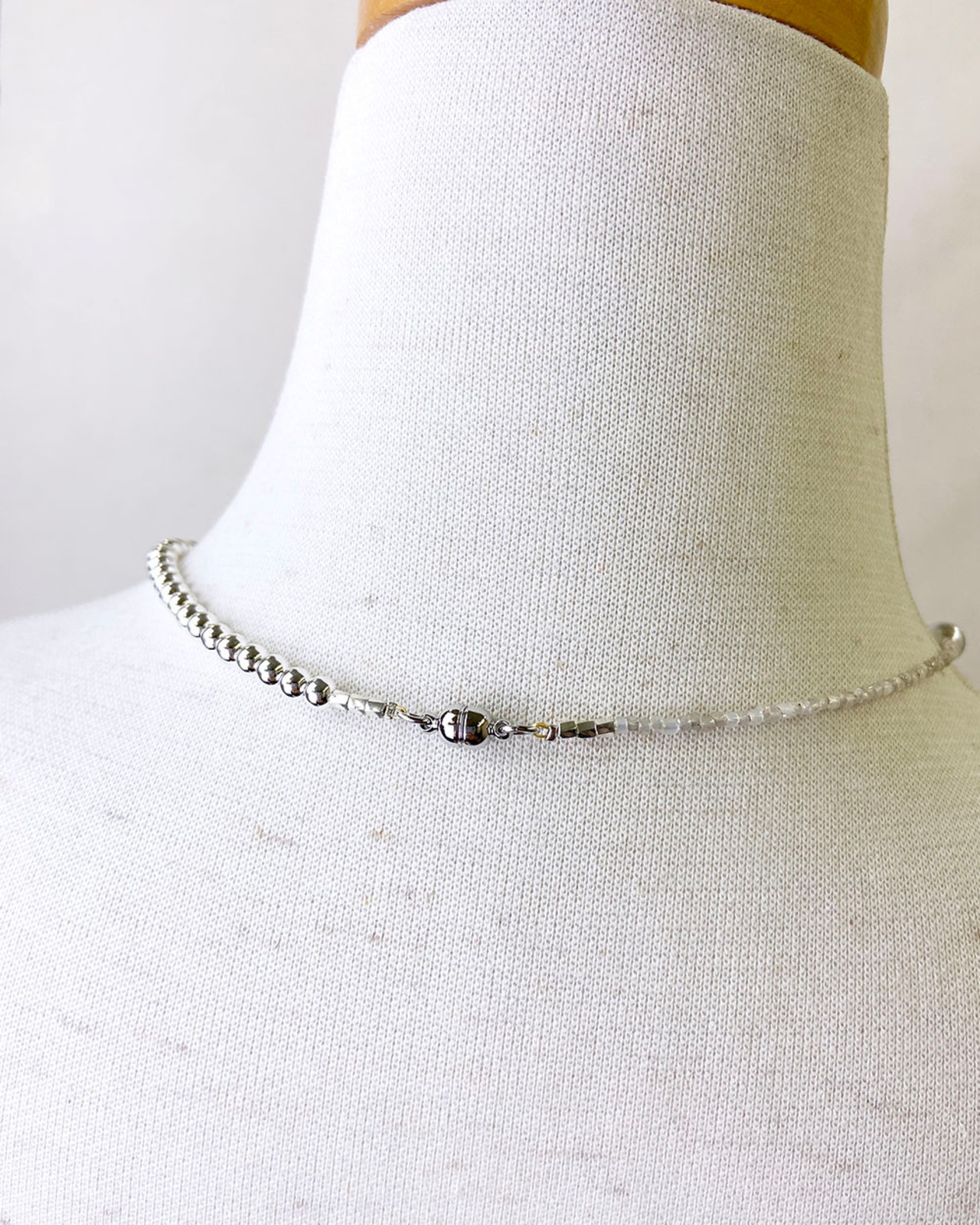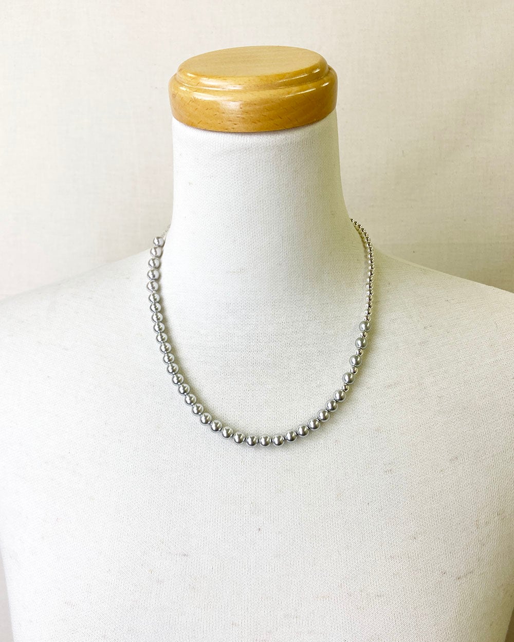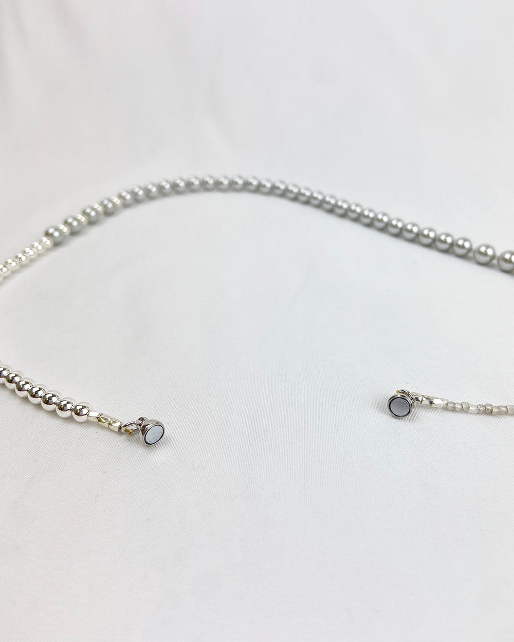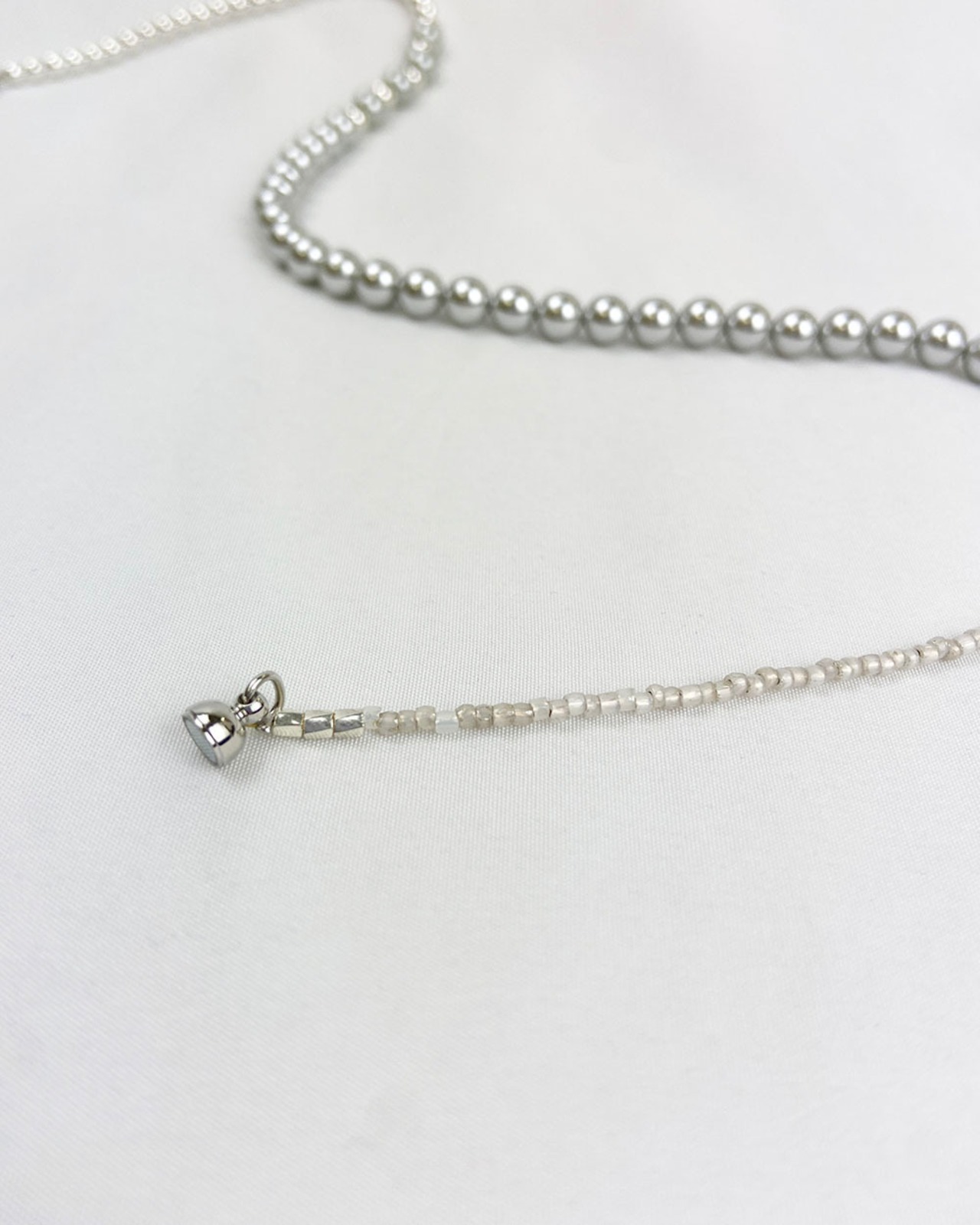 シルバーとグレーのトーンが織りなす静かな光沢が、首元にモダンなニュアンスを添えます。