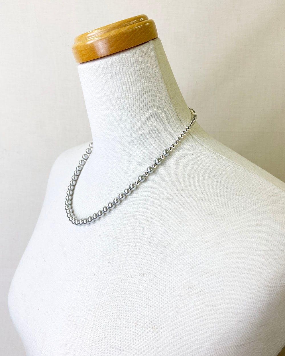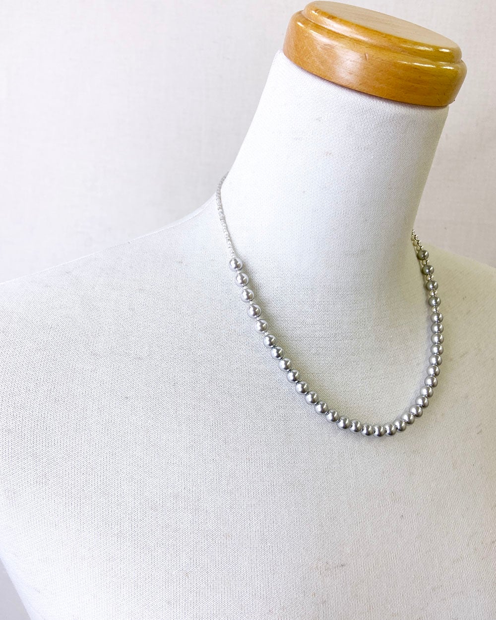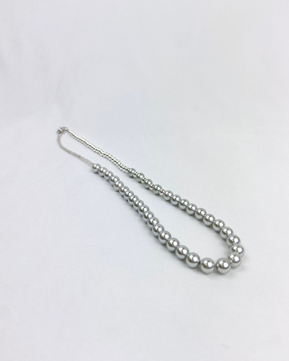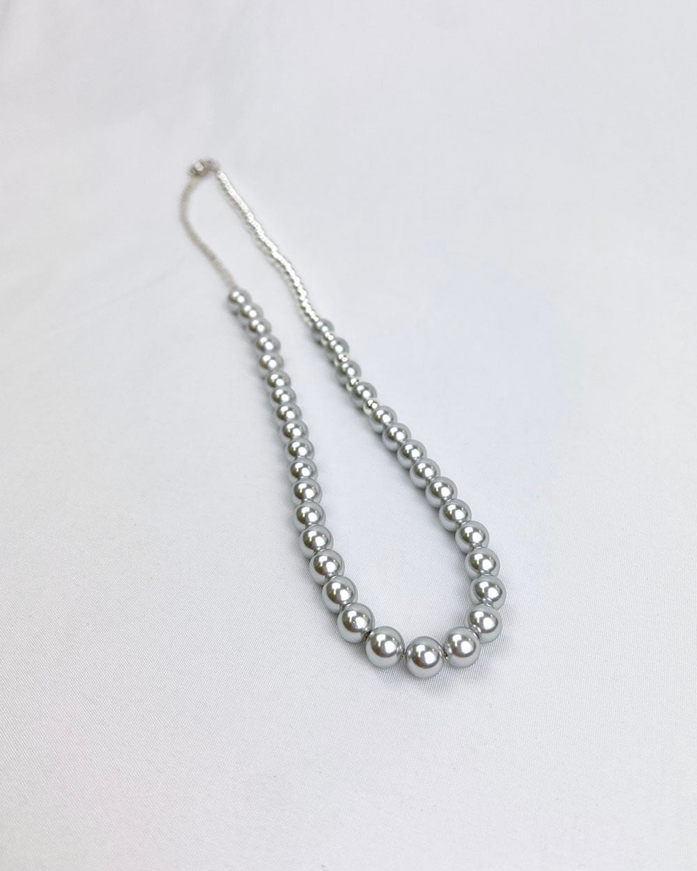 パール、ヘマタイトビーズ、シルバーカラーのシェルパール、グレーカラーのパールを組み合わせた、4種類のミックスネックレス。