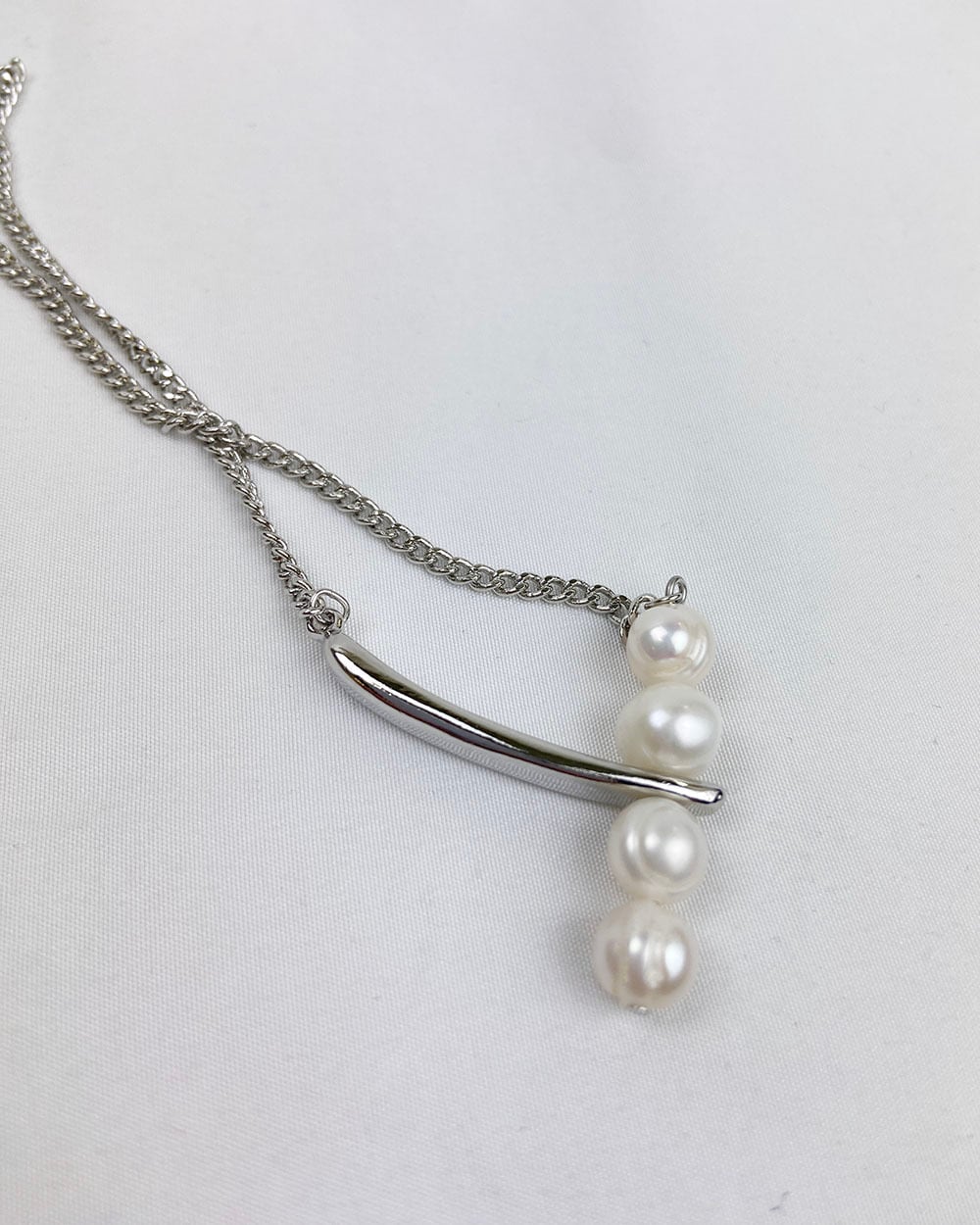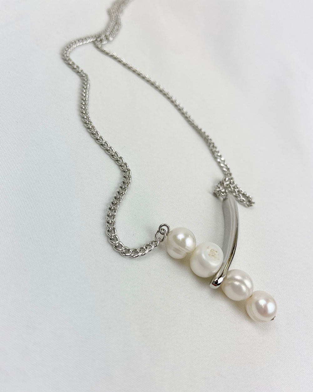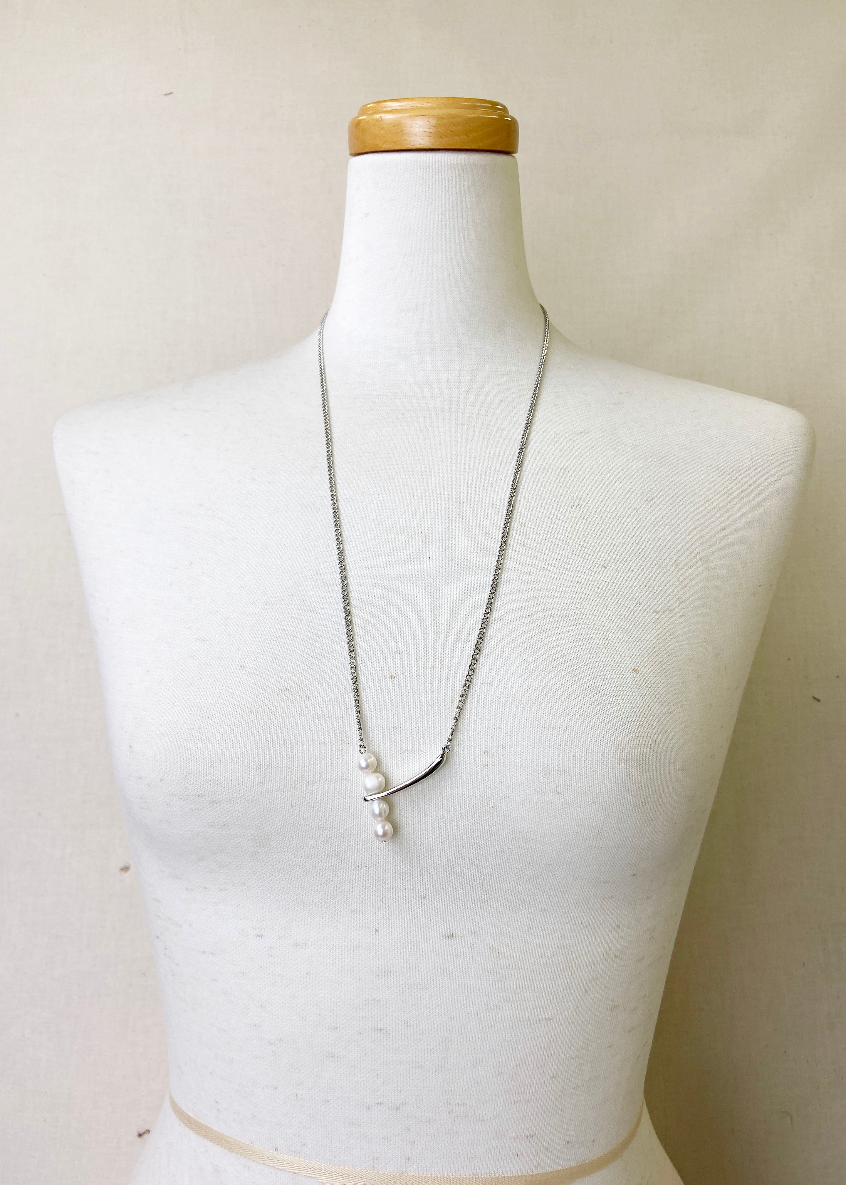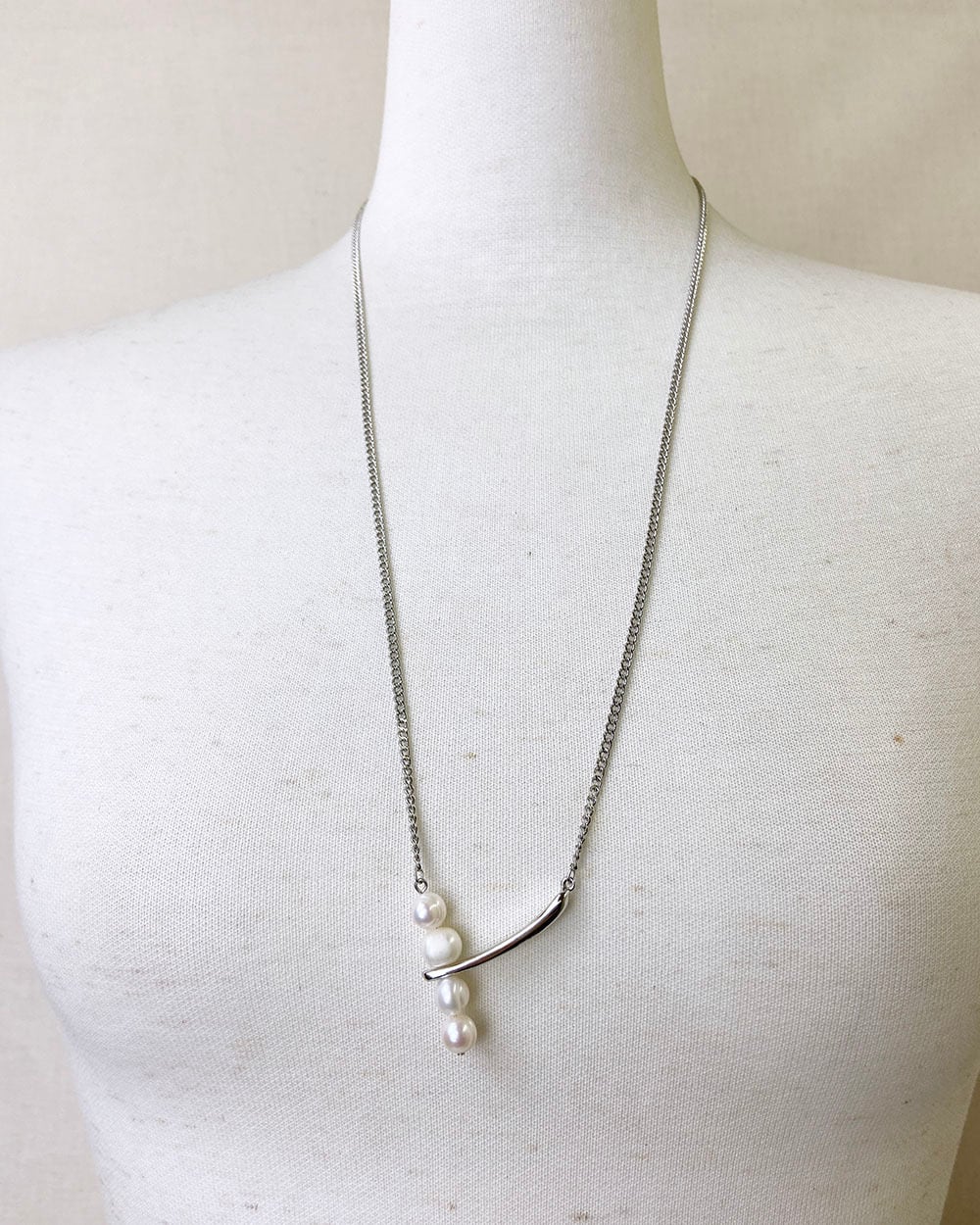 ロングチェーンにボリュームのある淡水パールを4つあしらった、印象的なデザインのネックレス。