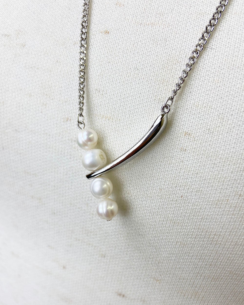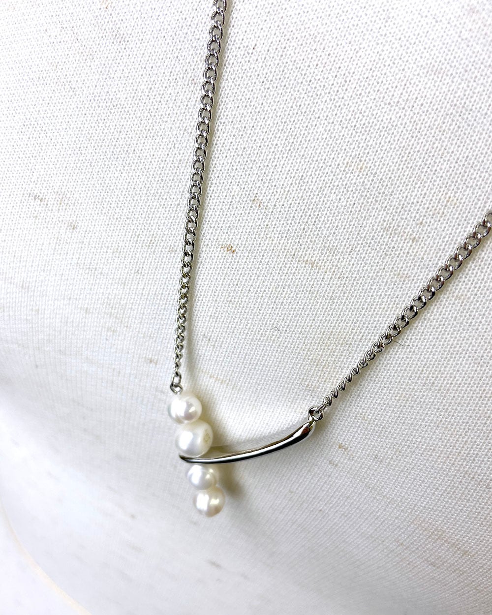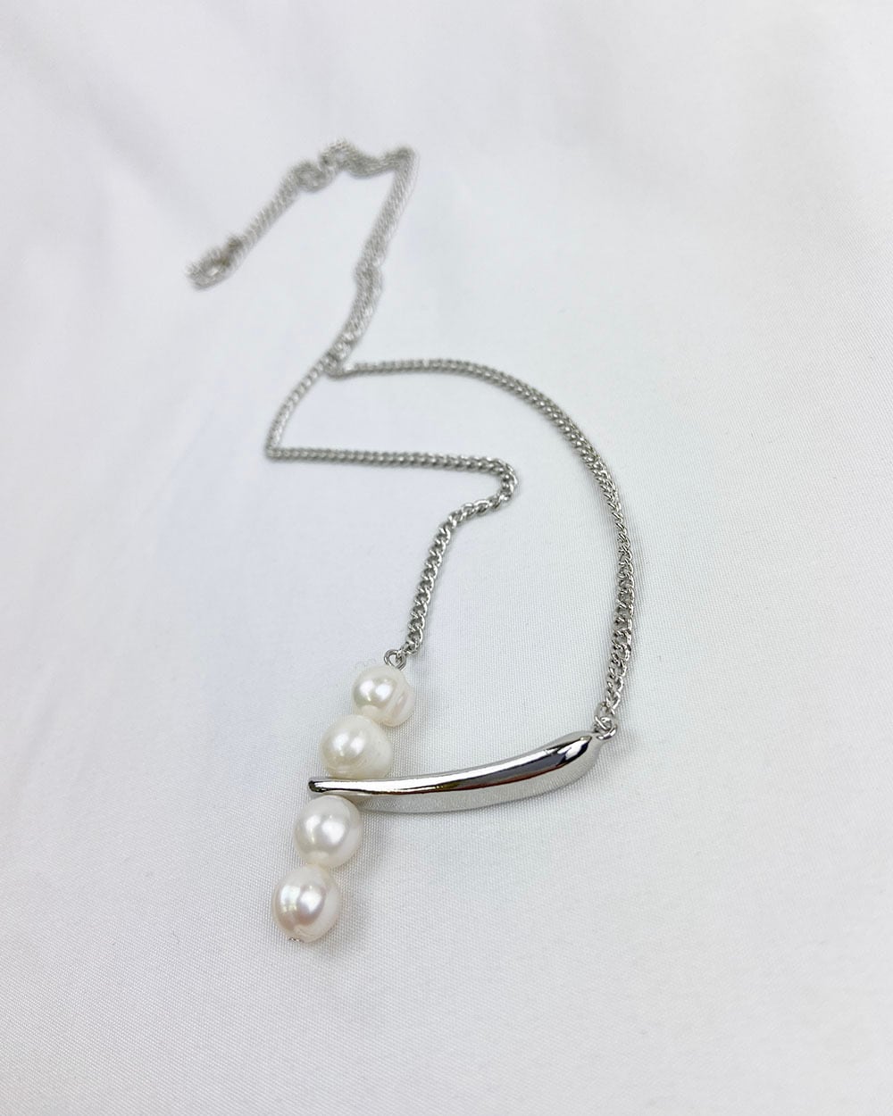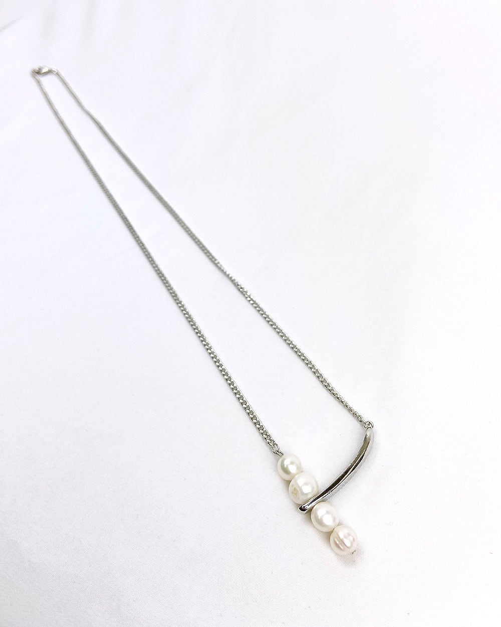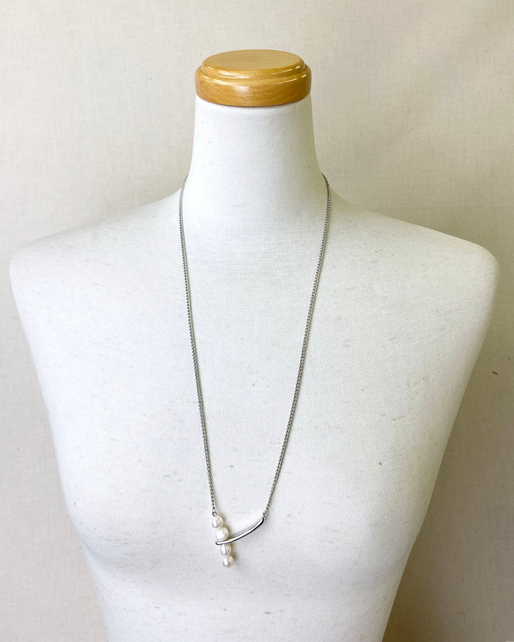 ロングチェーンにボリュームのある淡水パールを4つあしらった、印象的なデザインのネックレス。