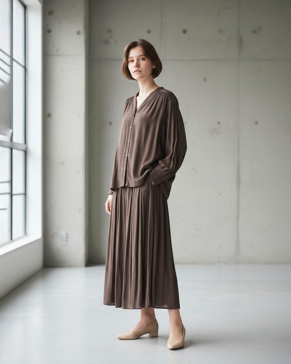 同素材のブラウスと合わせれば、セットアップとしても楽しめます。