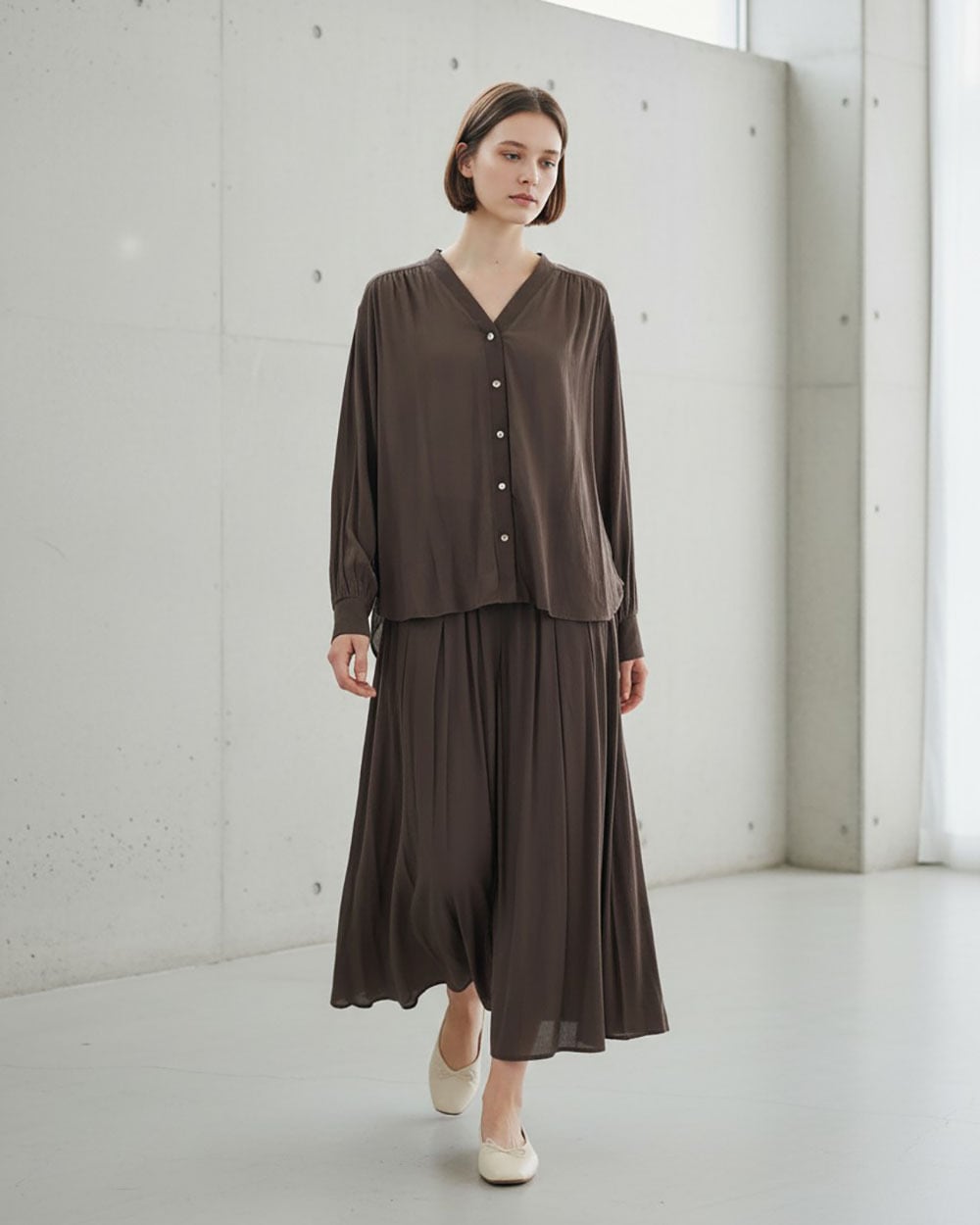 ・同素材のブラウスで、上品なセットアップスタイルに。