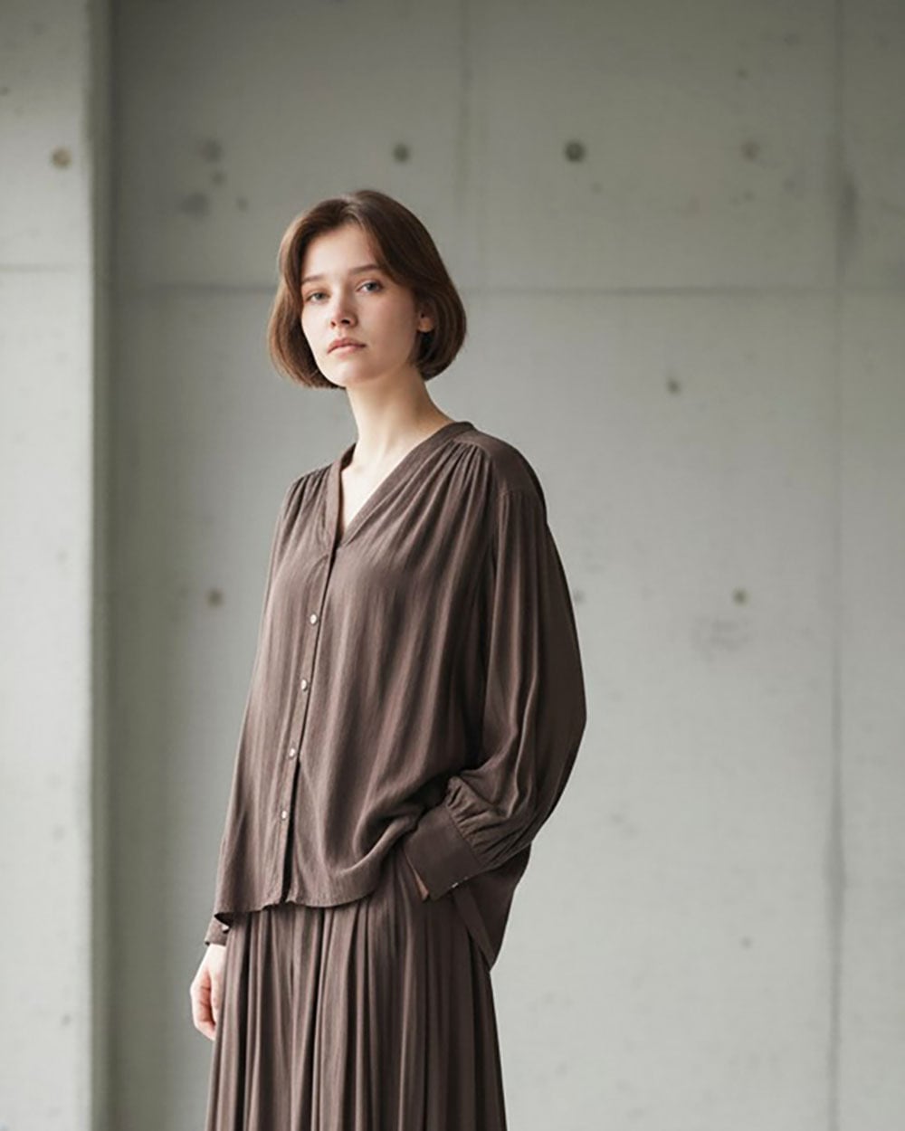 ・同素材のパンツと合わせて、上品なリラックススタイルに。