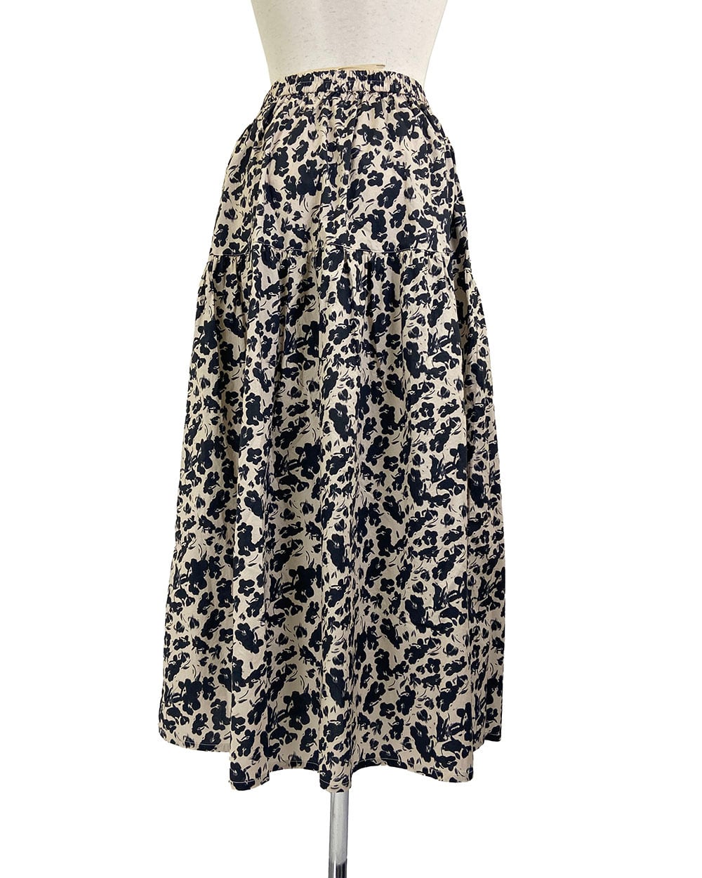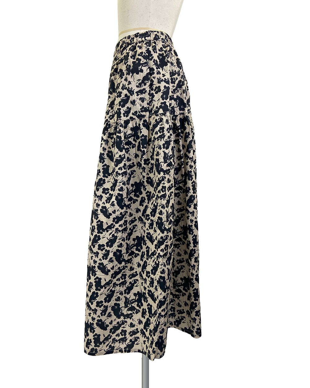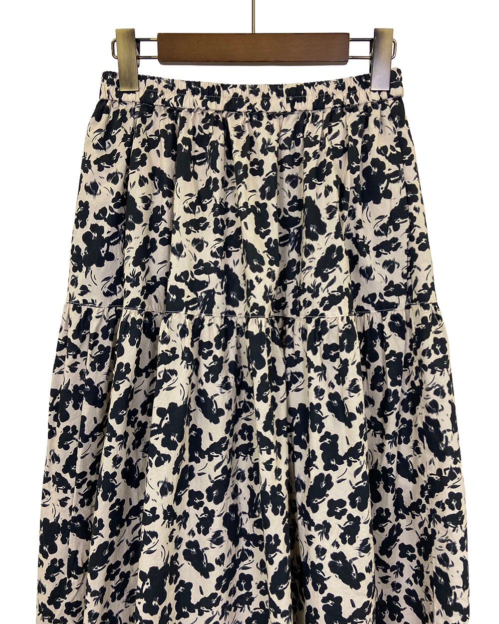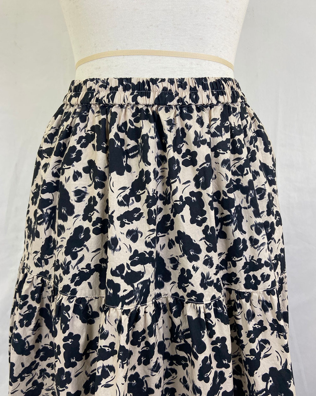 ベージュとブラックのフラワープリントが上品に映えるティアードスカート。