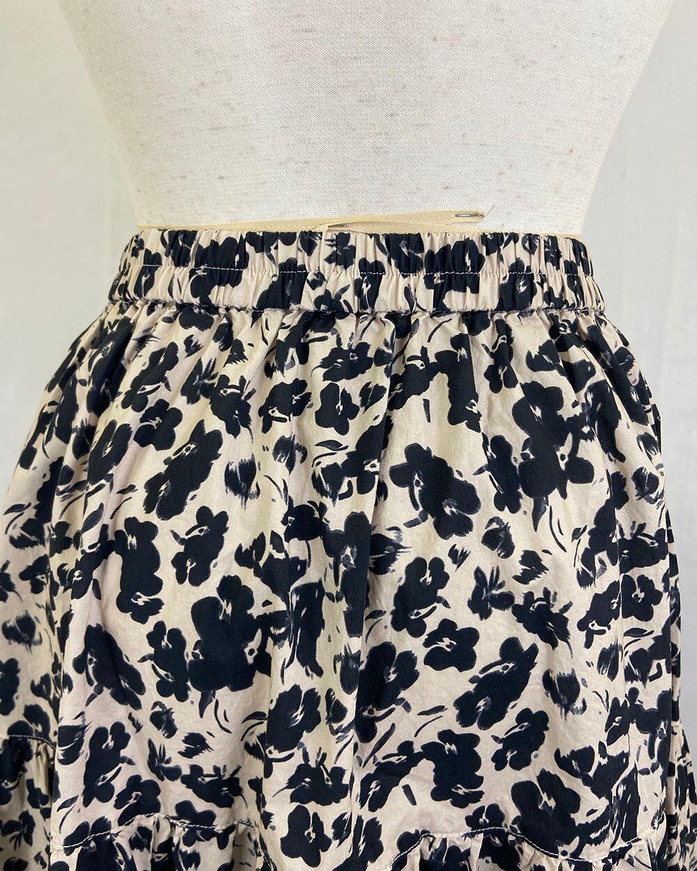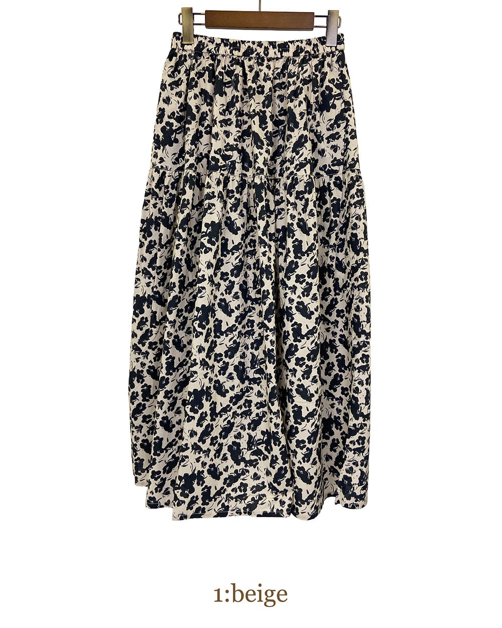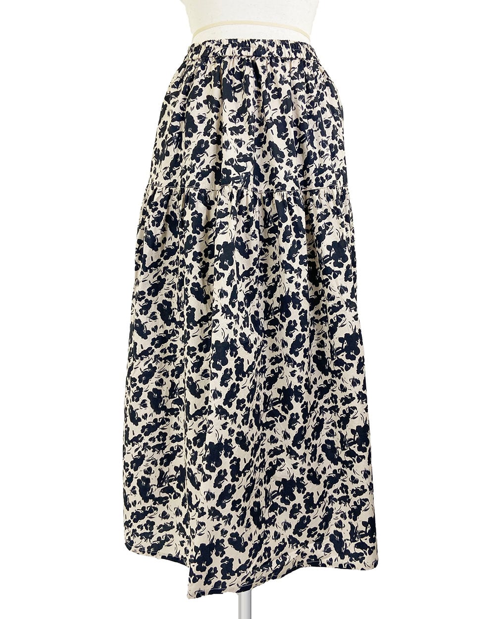 ベージュとブラックのフラワープリントが上品に映えるティアードスカート。
