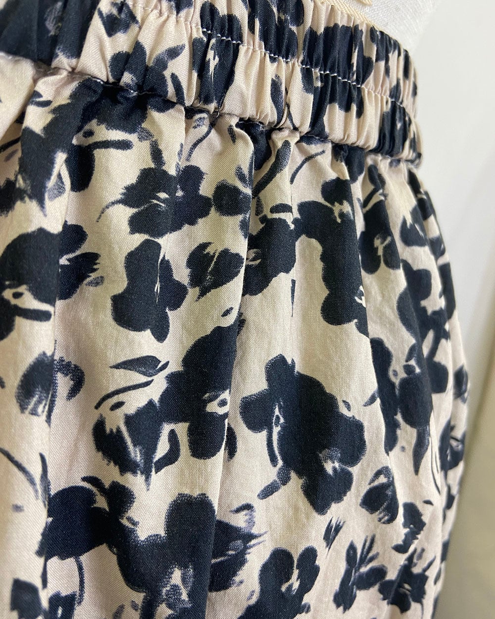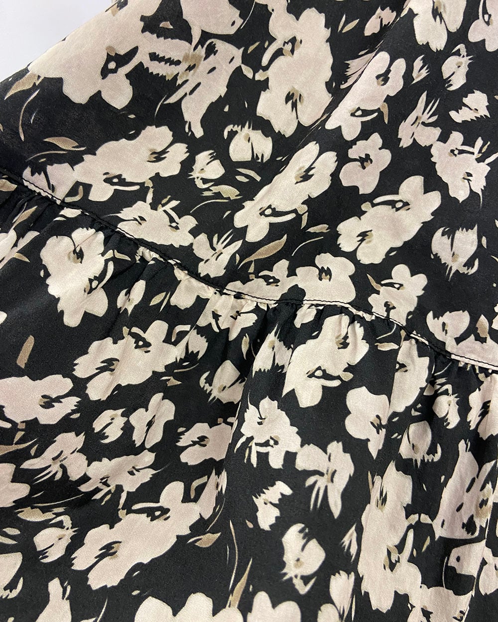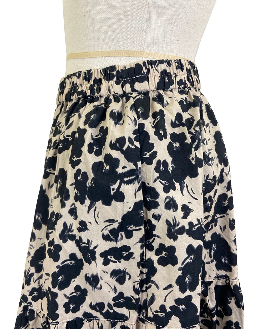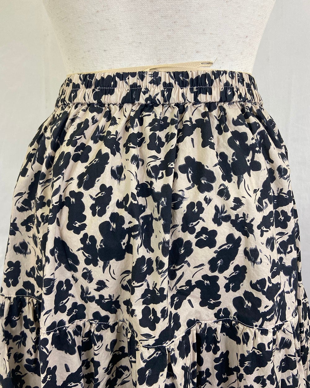 ベージュとブラックのフラワープリントが上品に映えるティアードスカート。