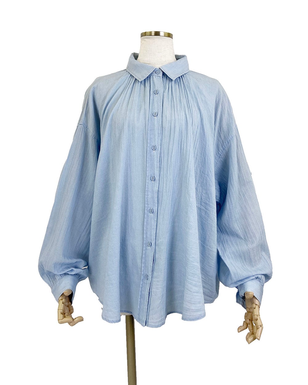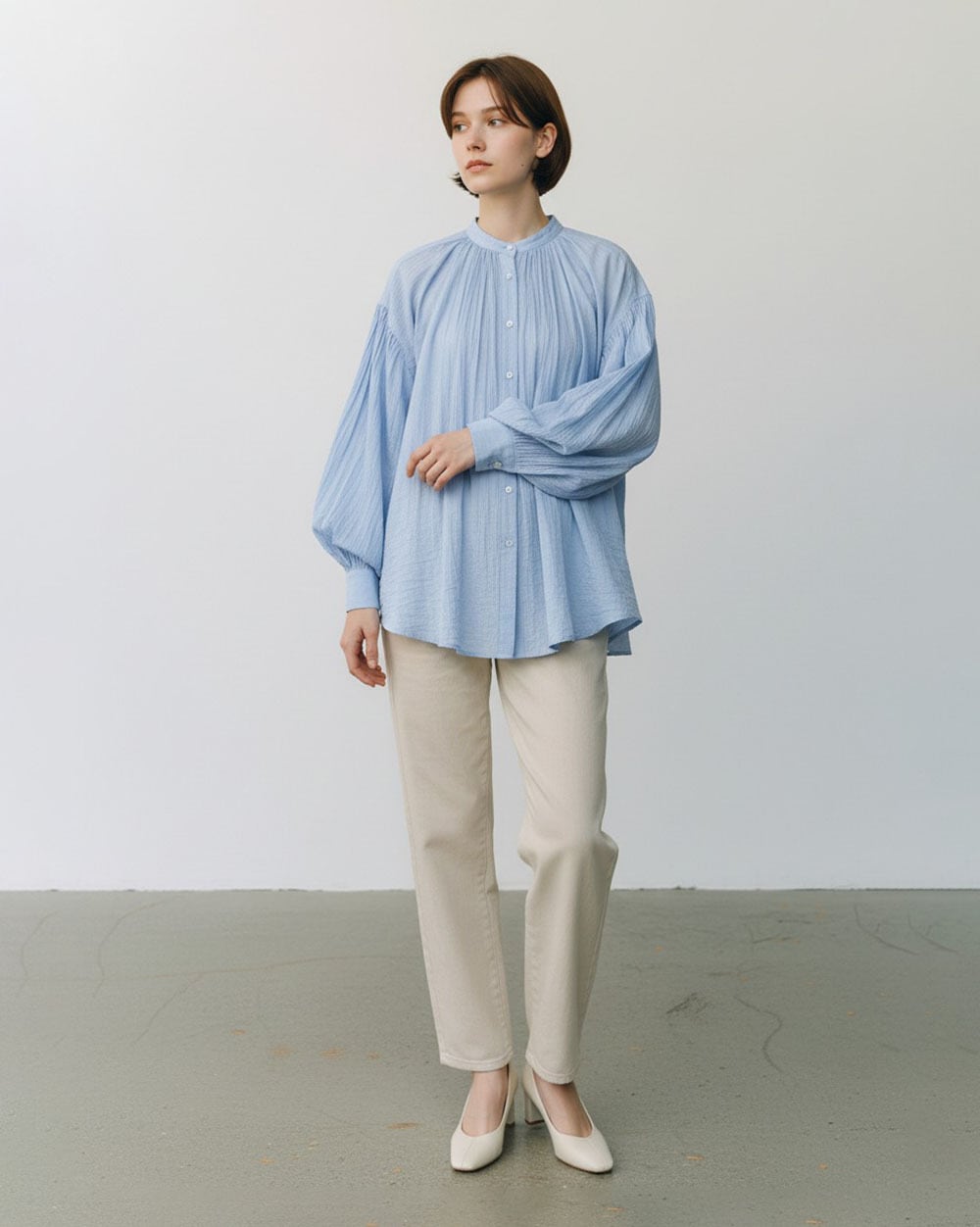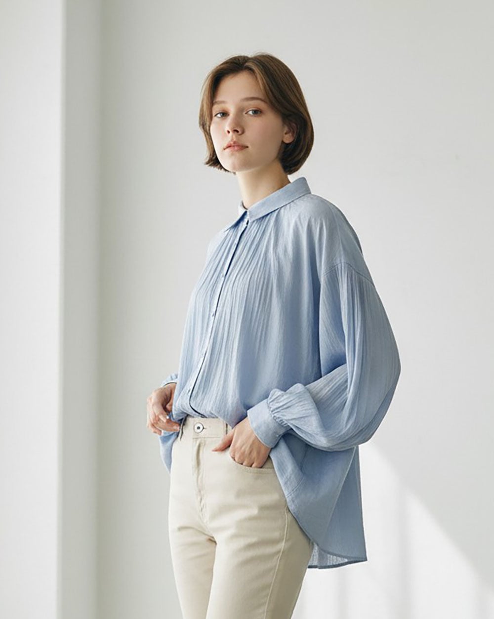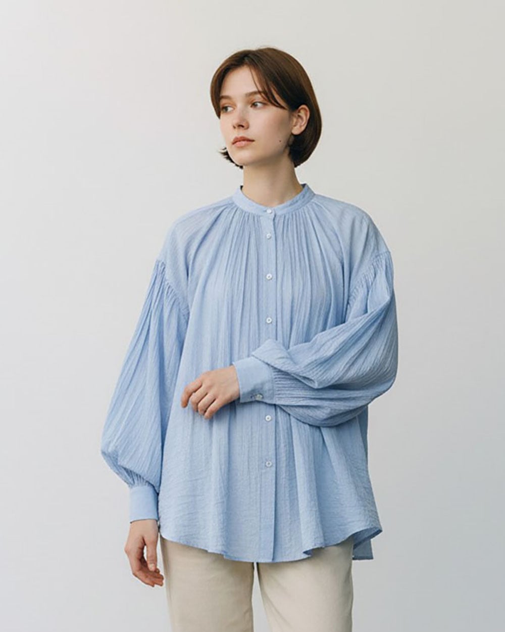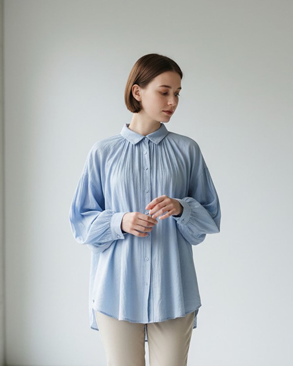 ふんわりとしたボリュームギャザーが女性らしい柔らかさを演出します。