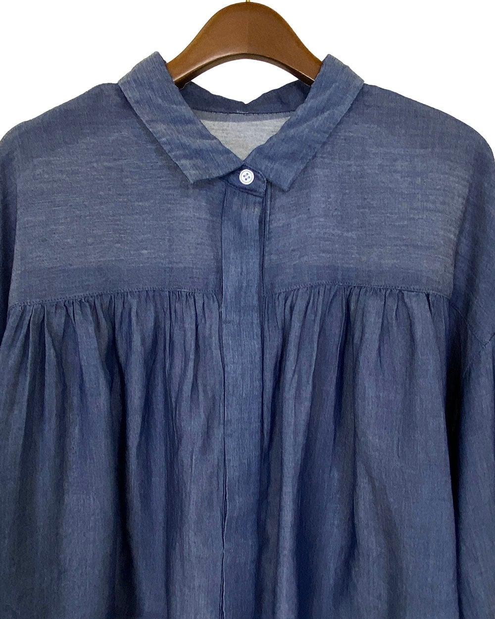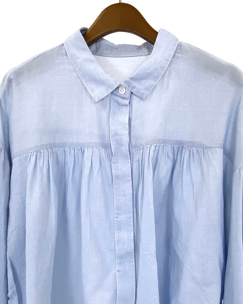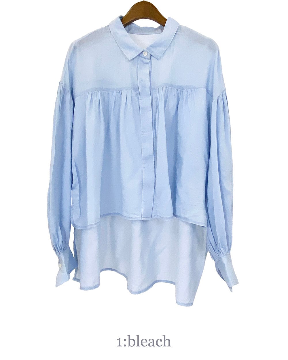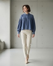 前後差のある着丈と、ヨーク・肩まわり・袖口に入った繊細なギャザーが女性らしい柔らかさを引き立てます。