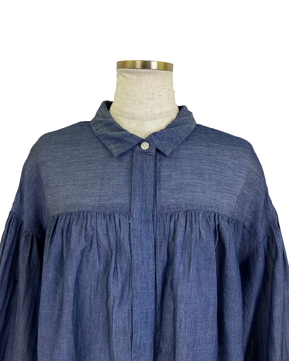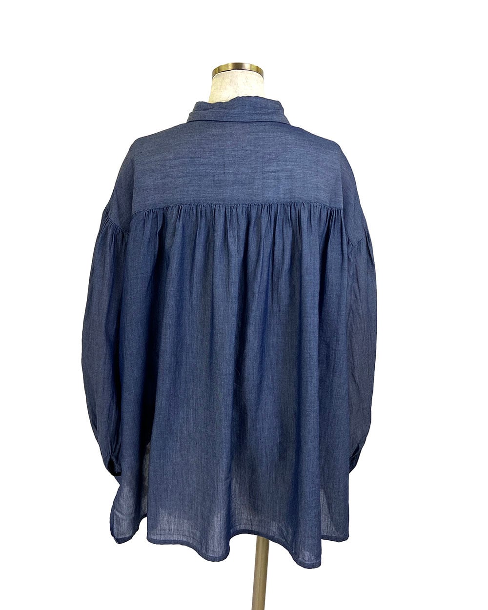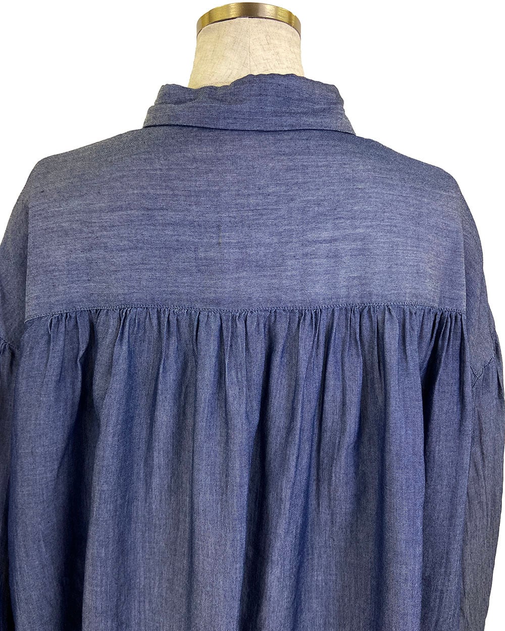 前後差のある着丈と、ヨーク・肩まわり・袖口に入った繊細なギャザーが女性らしい柔らかさを引き立てます。
