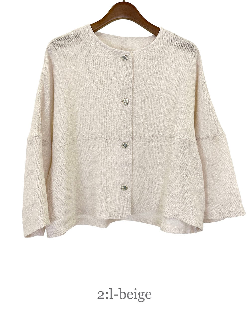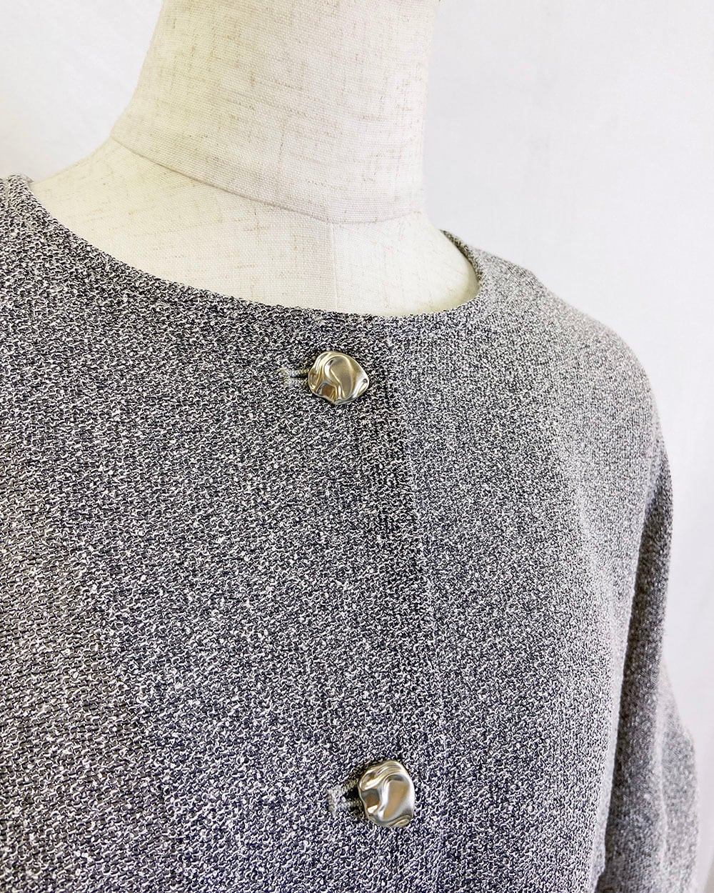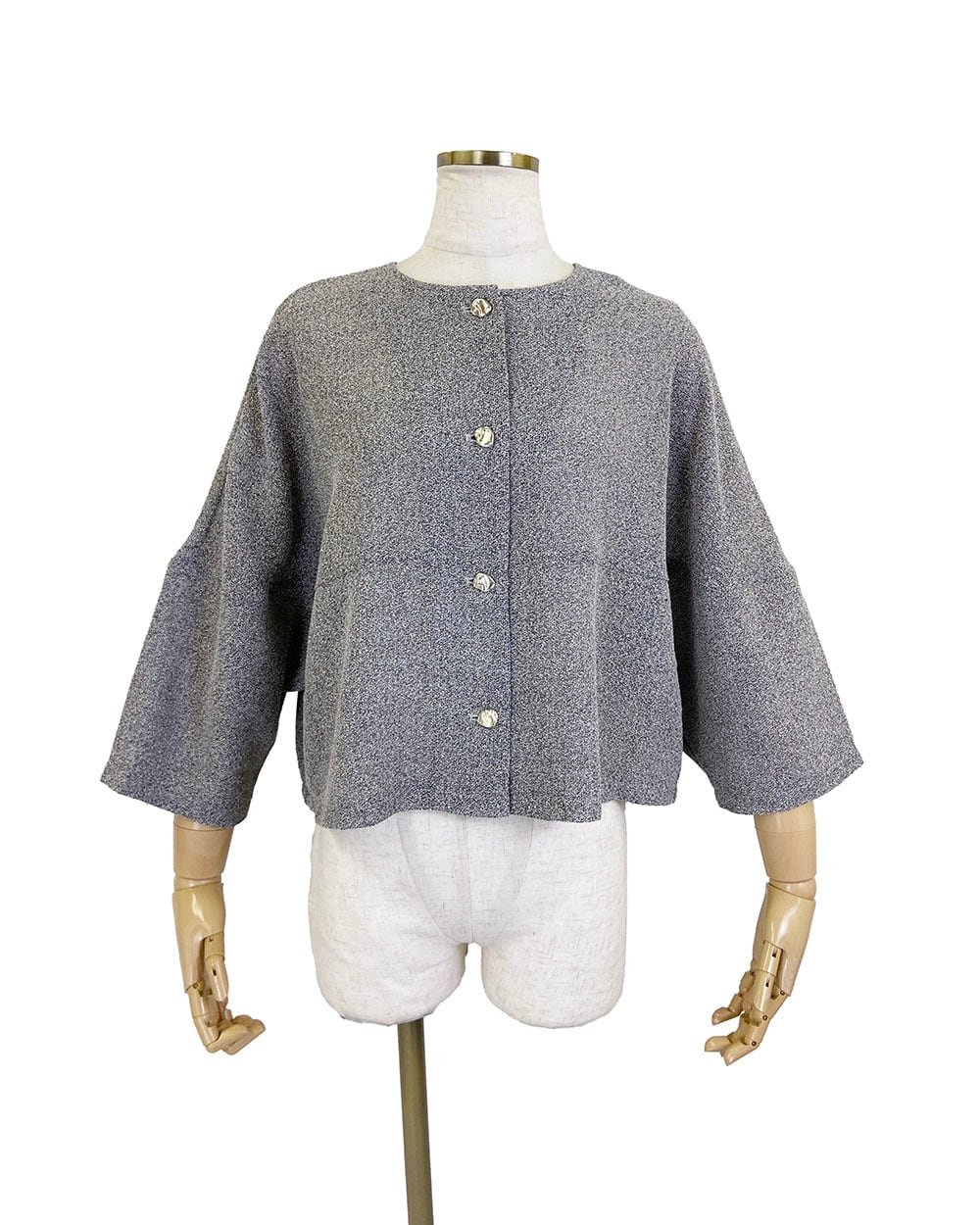 ラメ糸を編み込んだメッシュ生地が、上品なきらめきを放つクルーネックジャケット。
