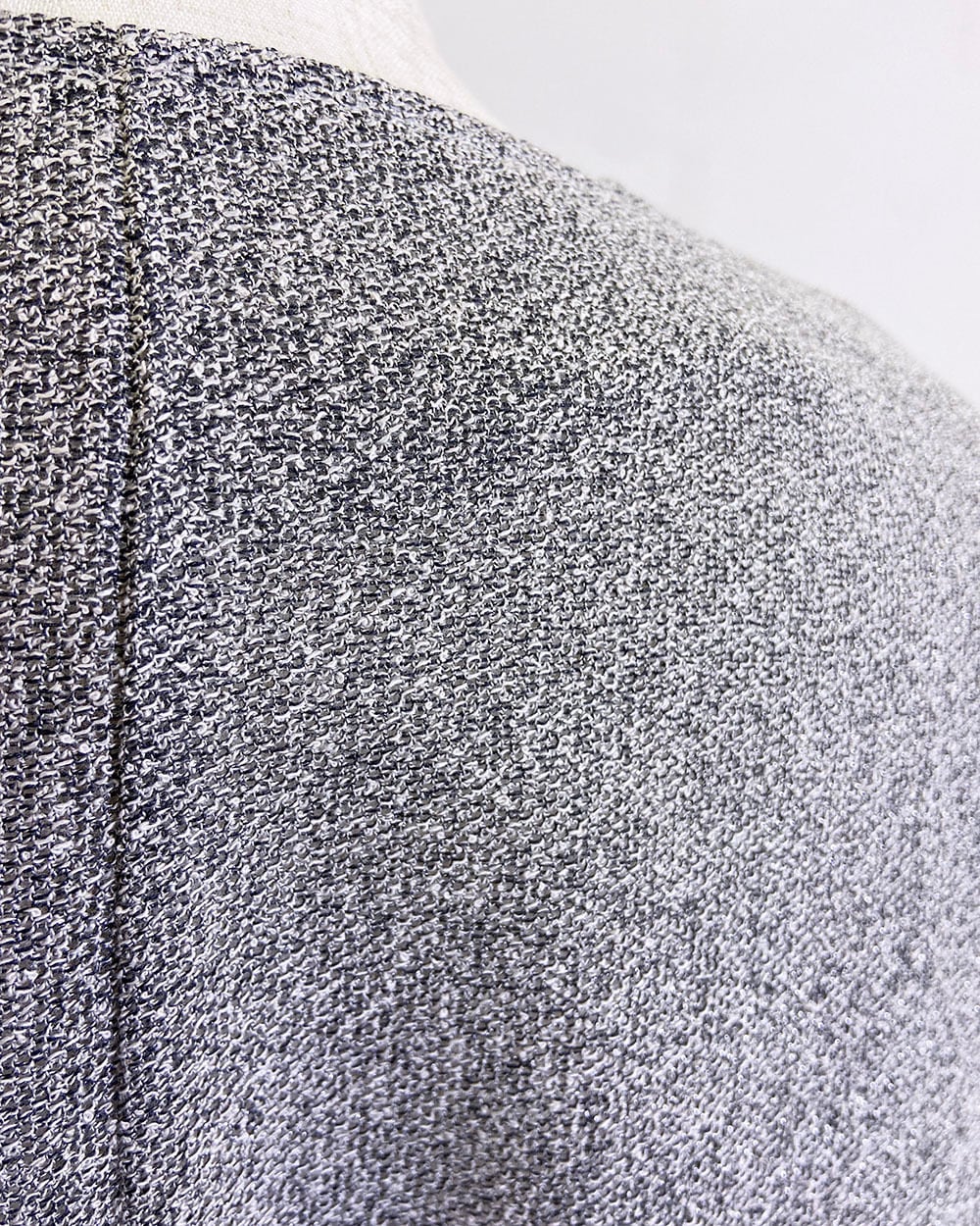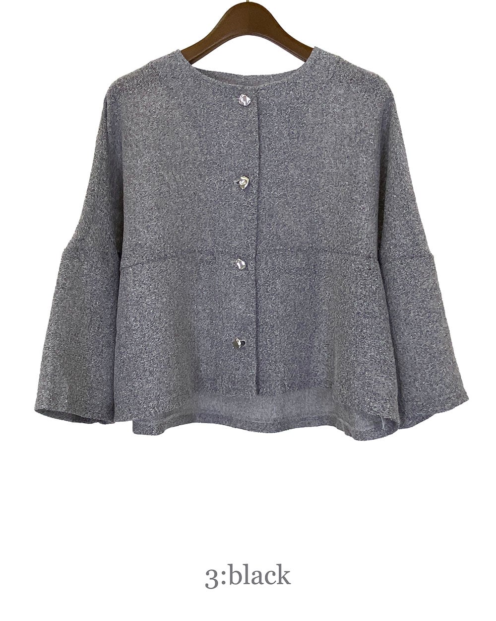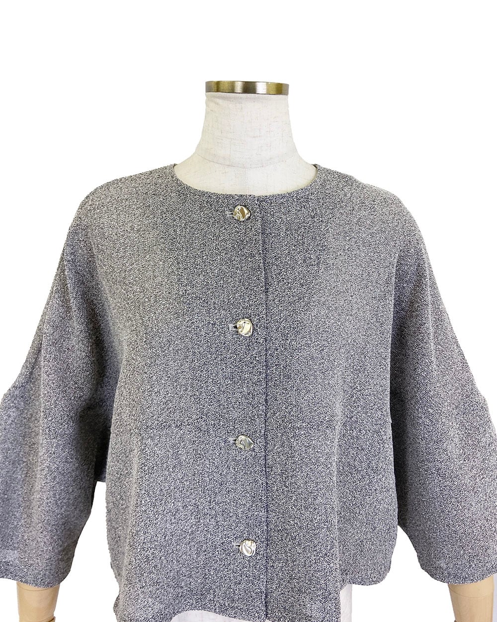 ラメ糸を編み込んだメッシュ生地が、上品なきらめきを放つクルーネックジャケット。