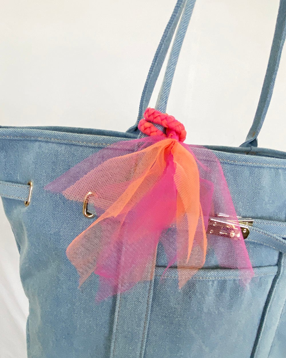 カラフルなチュールの配色タッセル飾りが華やかさを添え、持つだけでコーデのポイントに。
