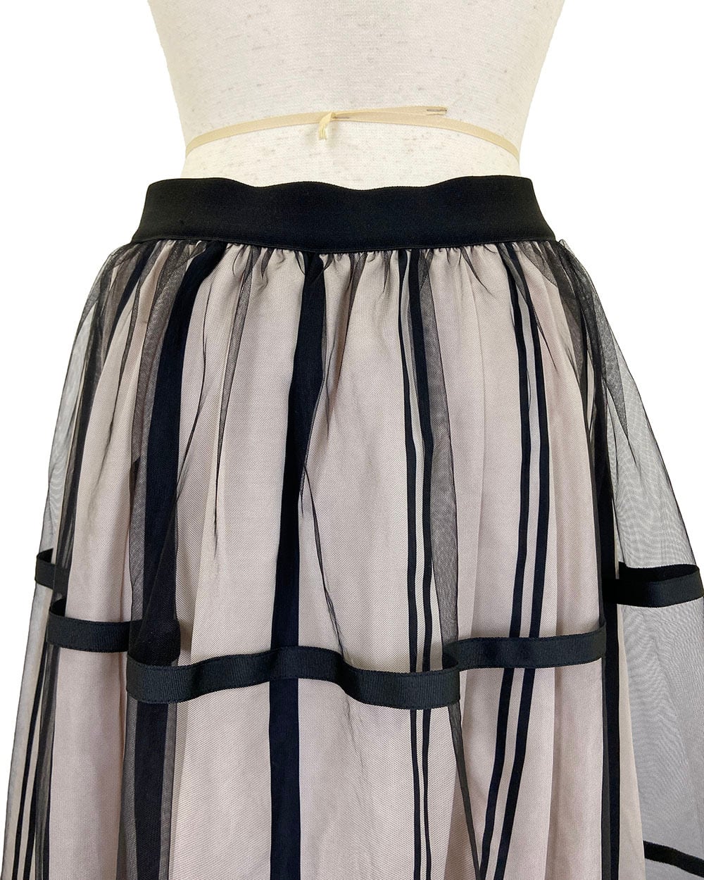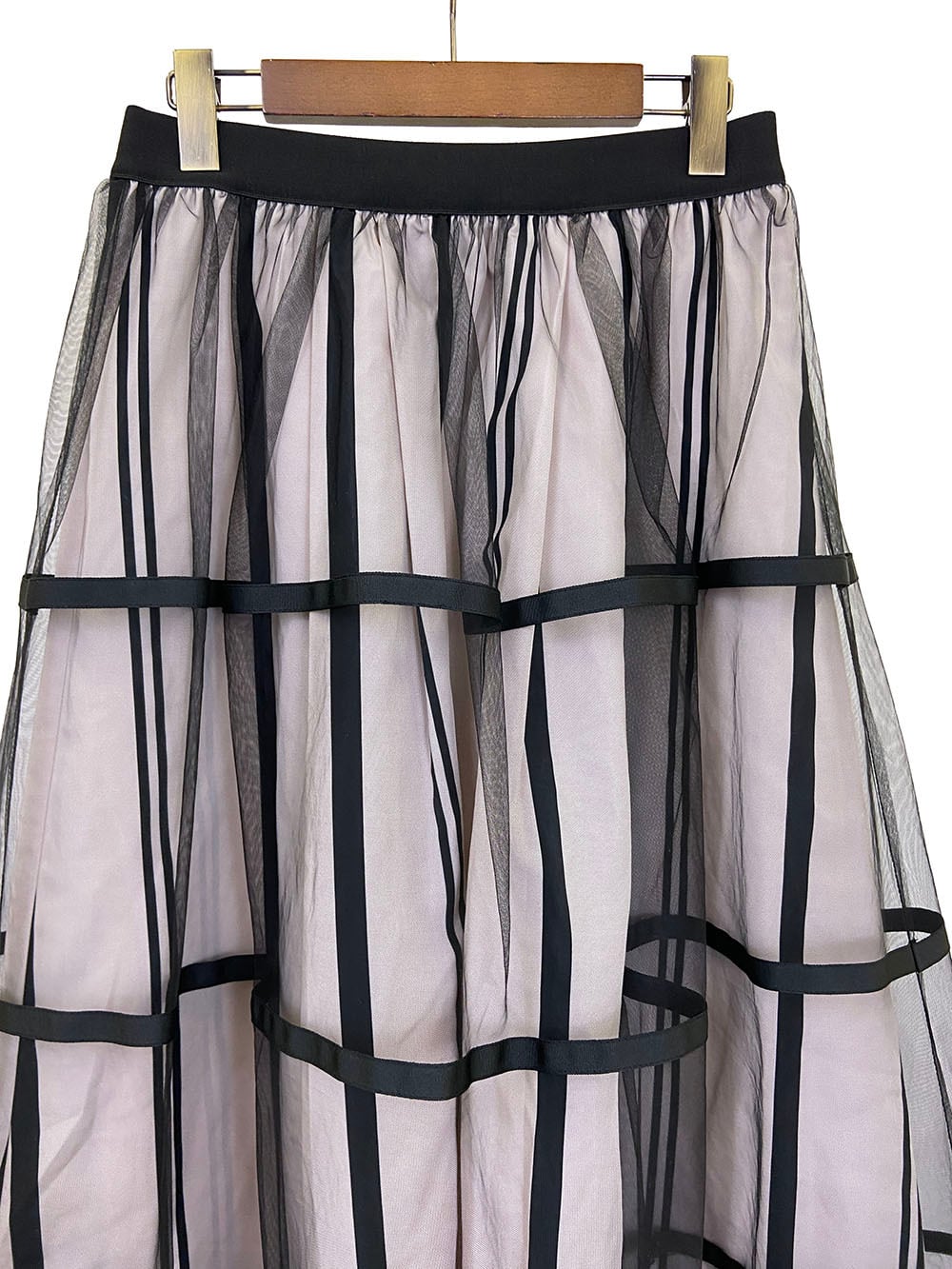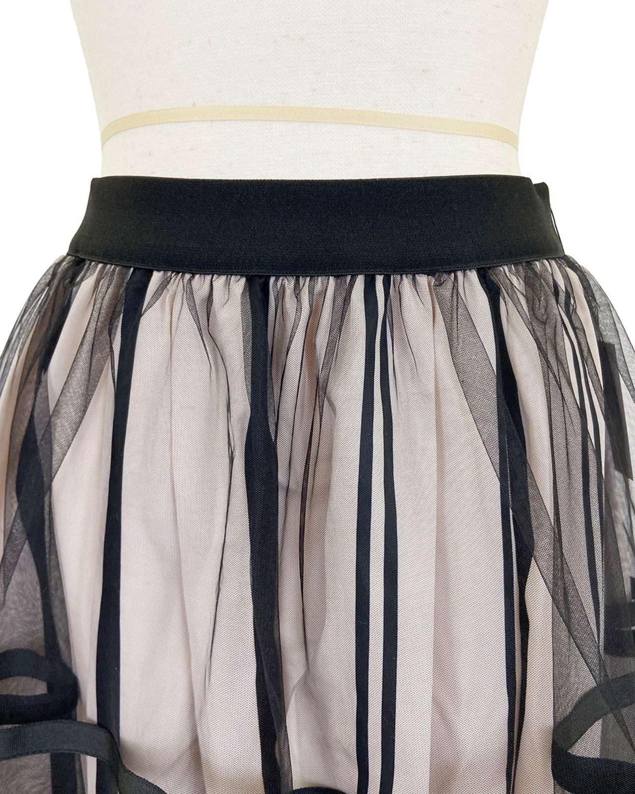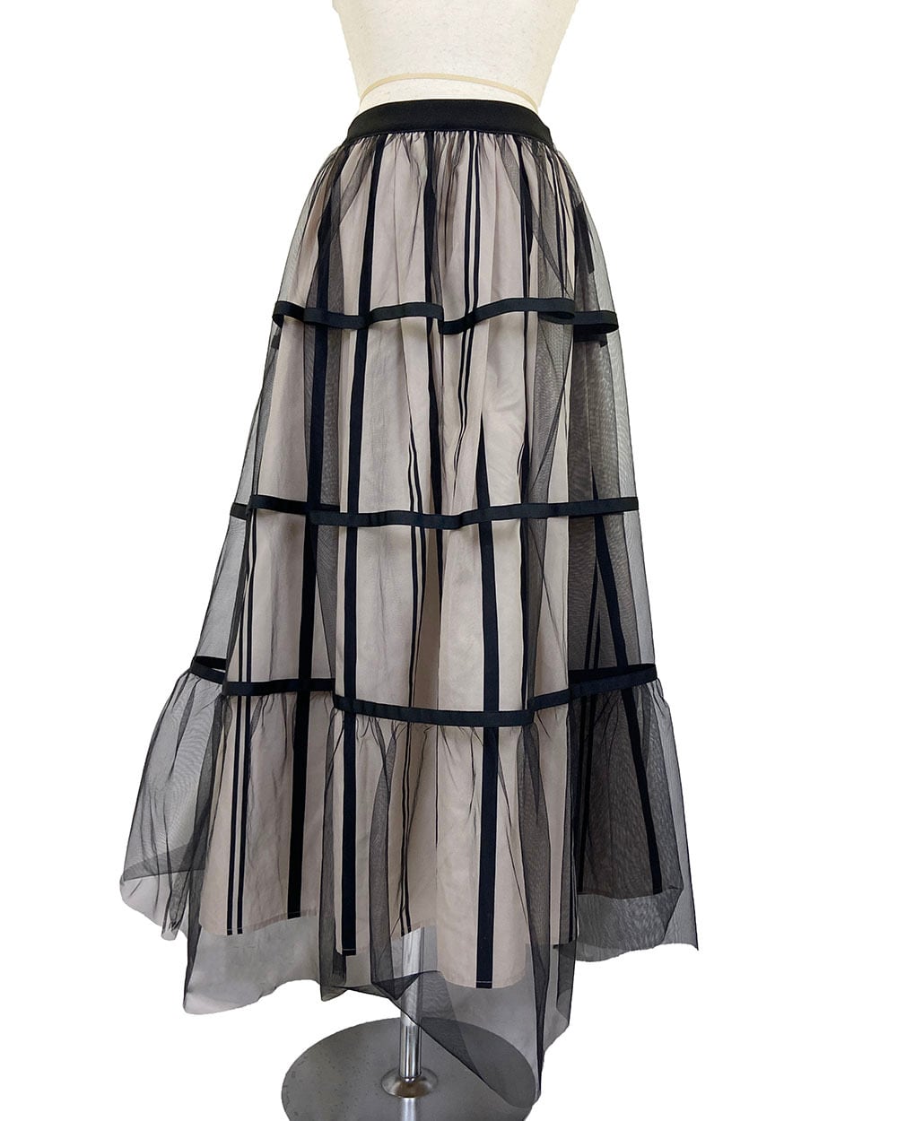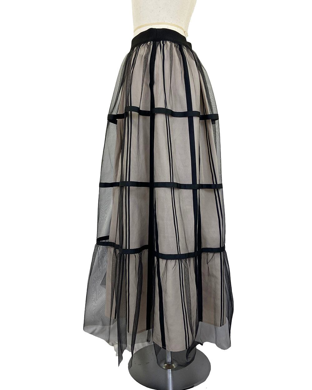 軽やかなギャザーフレアースカートに、ブラックチュールを重ねたレイヤードデザイン。
