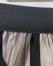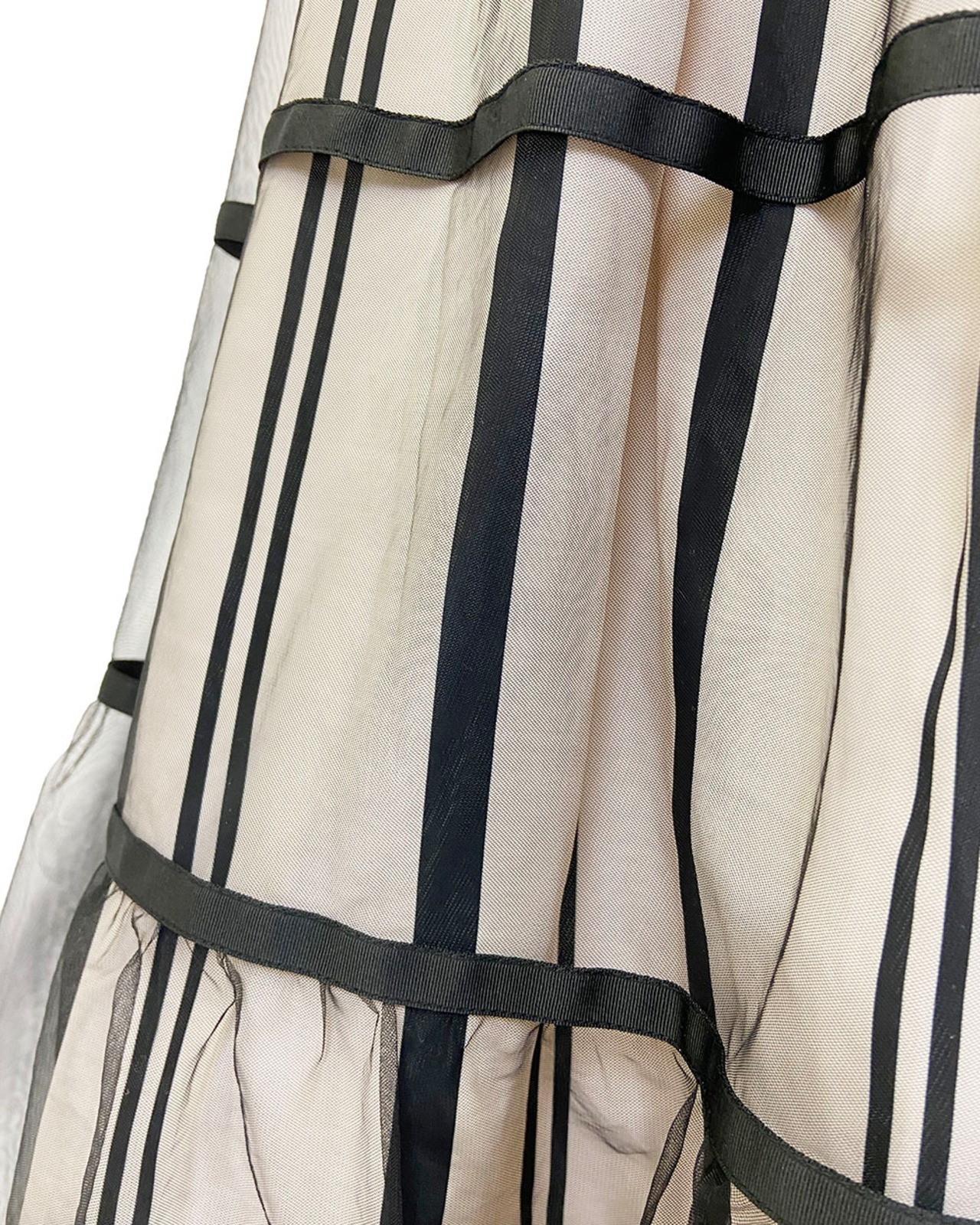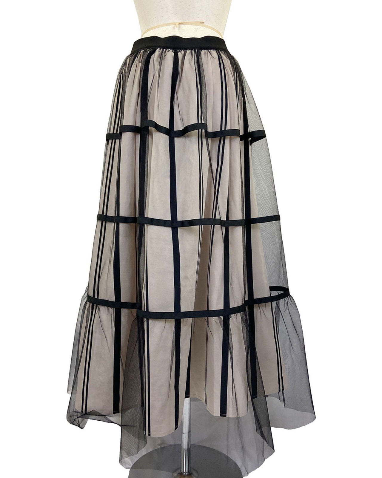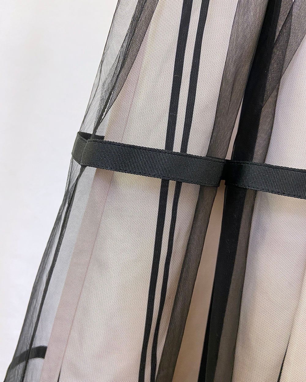 チュールにはグログランテープを3段にあしらい、立体感のある横ラインがスタイリングにリズムをプラス。