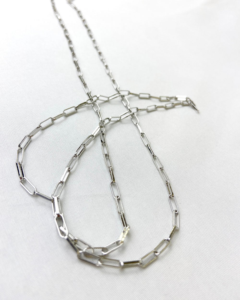 シンプルなデザインながらも、チェーンそのもののフォルムと質感がスタイルに奥行きを与えます。