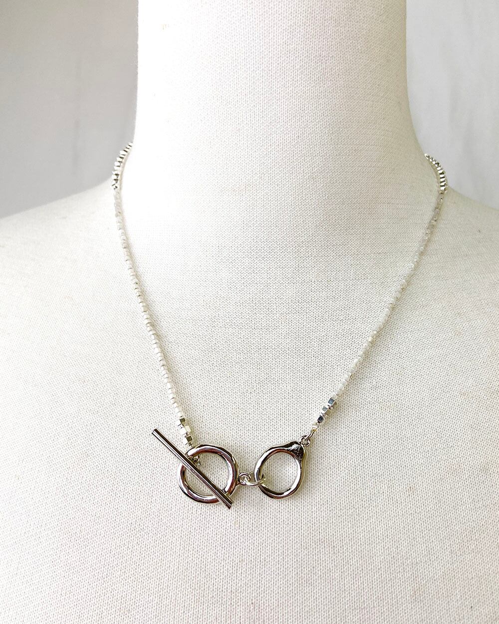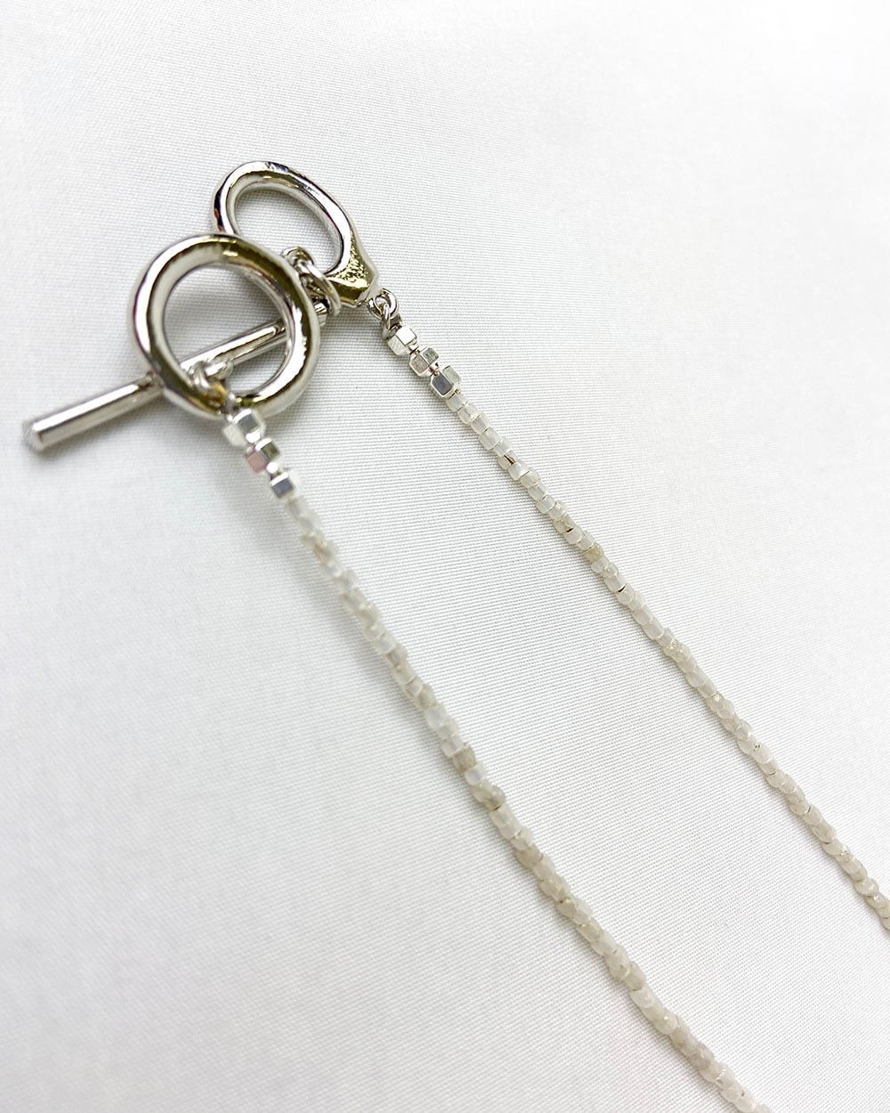 シルバーメッキを施したヘマタイトとの組み合わせが、クールで清涼感のあるカラーリングに。