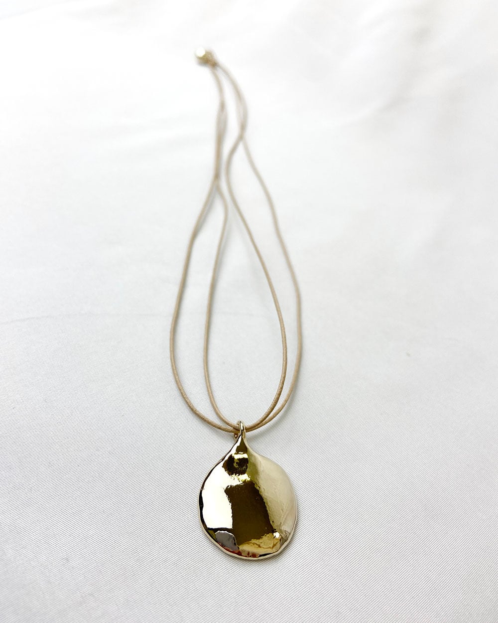 丸くて窪んだツルツルのパーツが印象的な、上品カジュアルなコードネックレス。