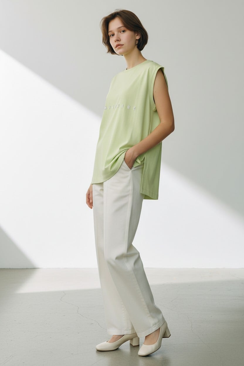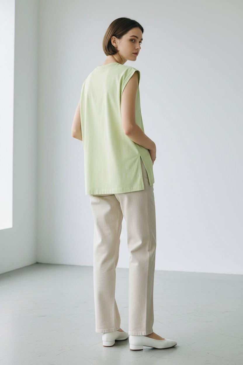 前後で長さに差をつけたイレギュラーヘムとサイドスリットが、抜け感のあるシルエットを演出します。
