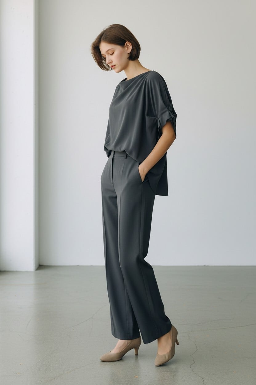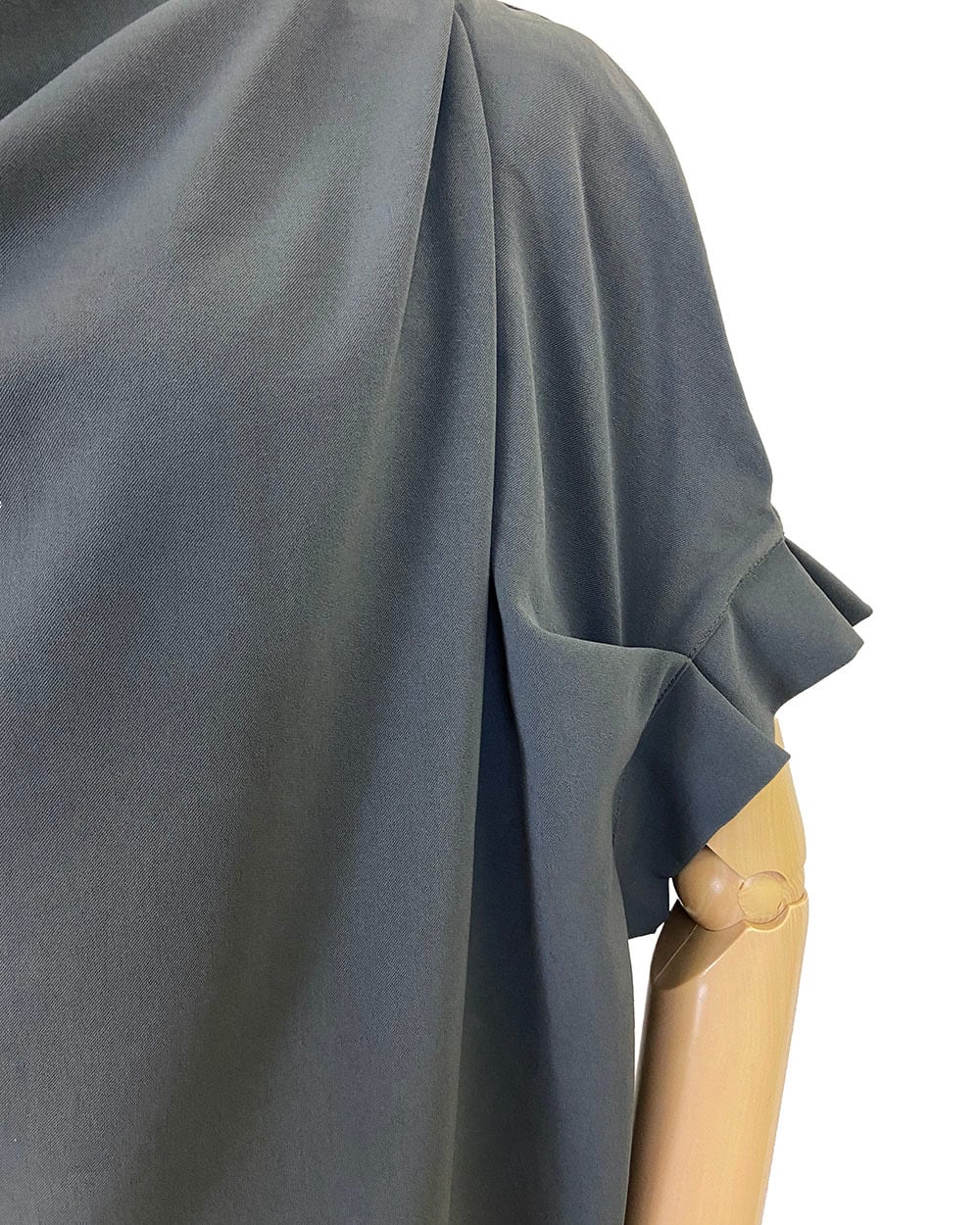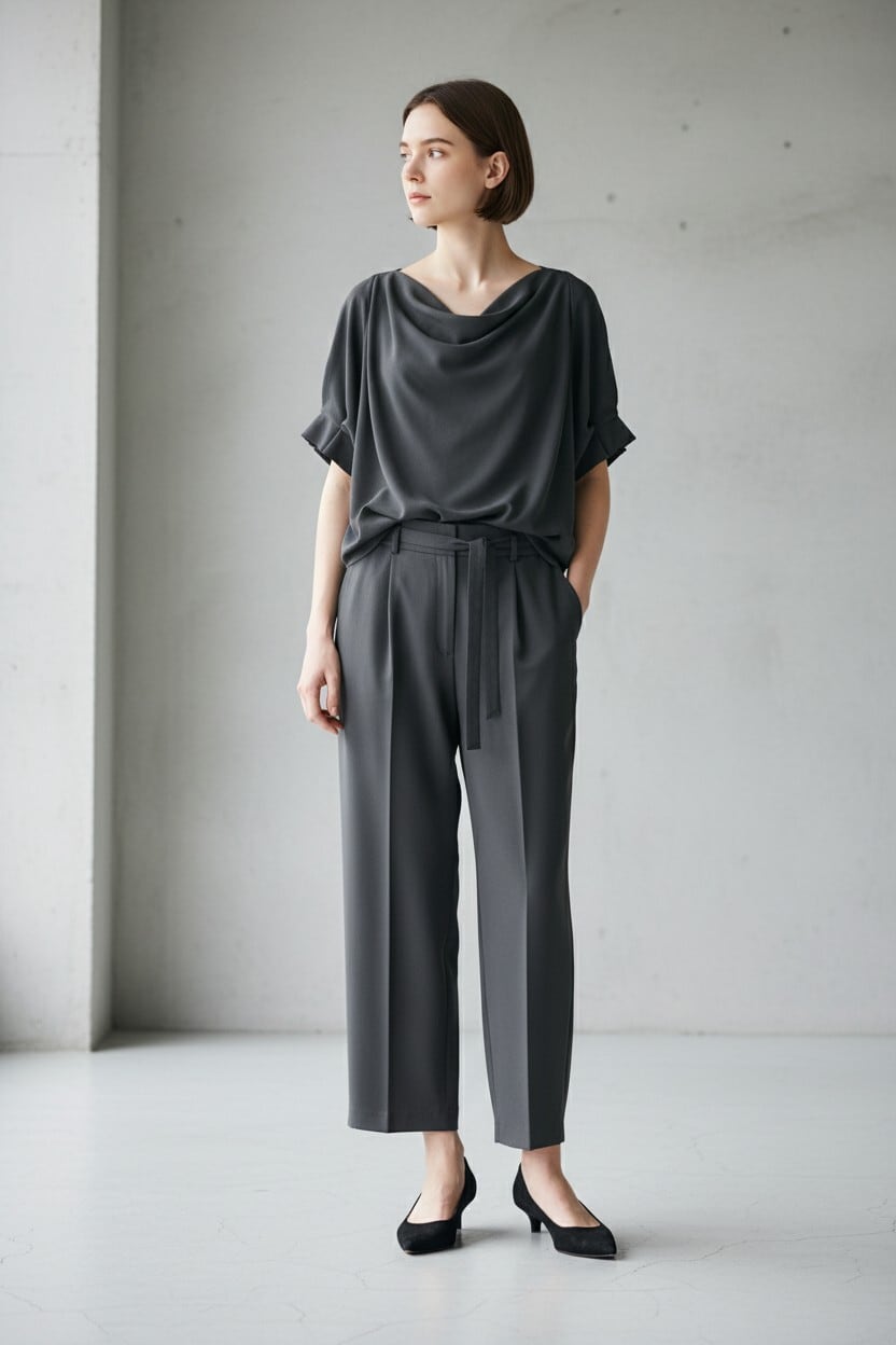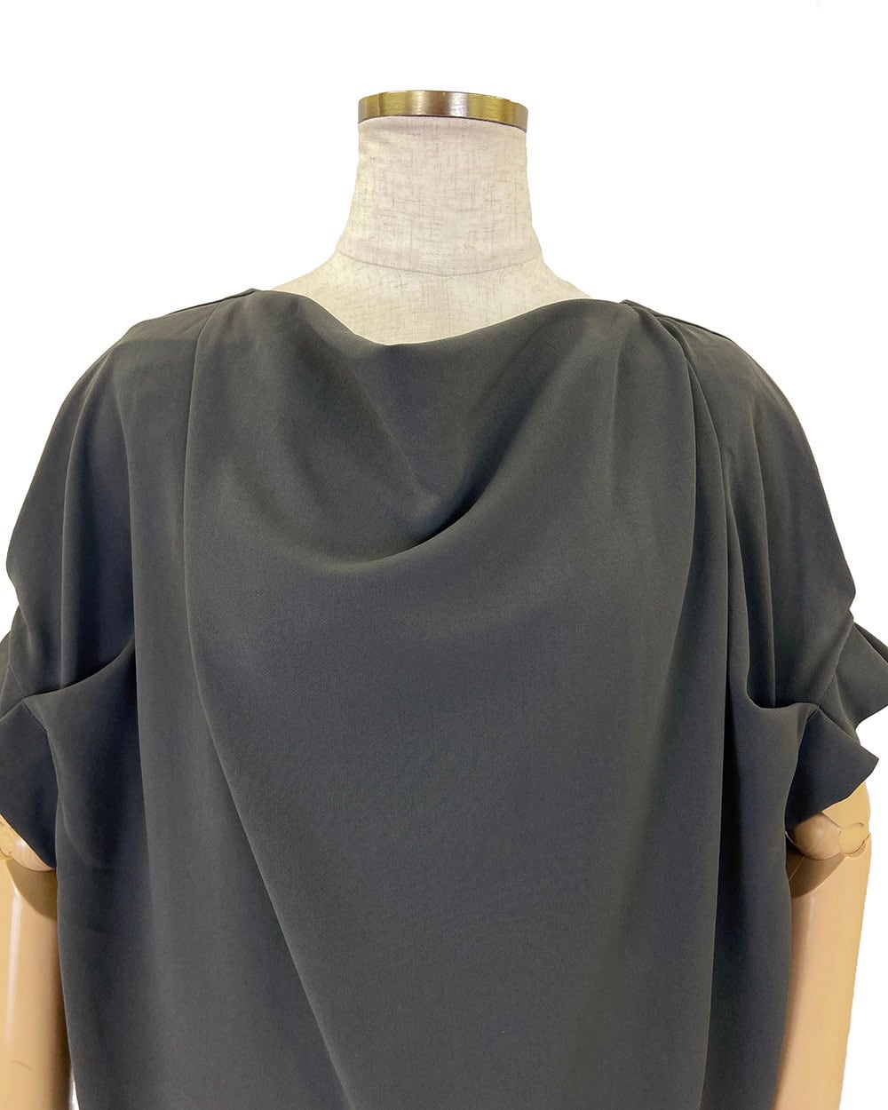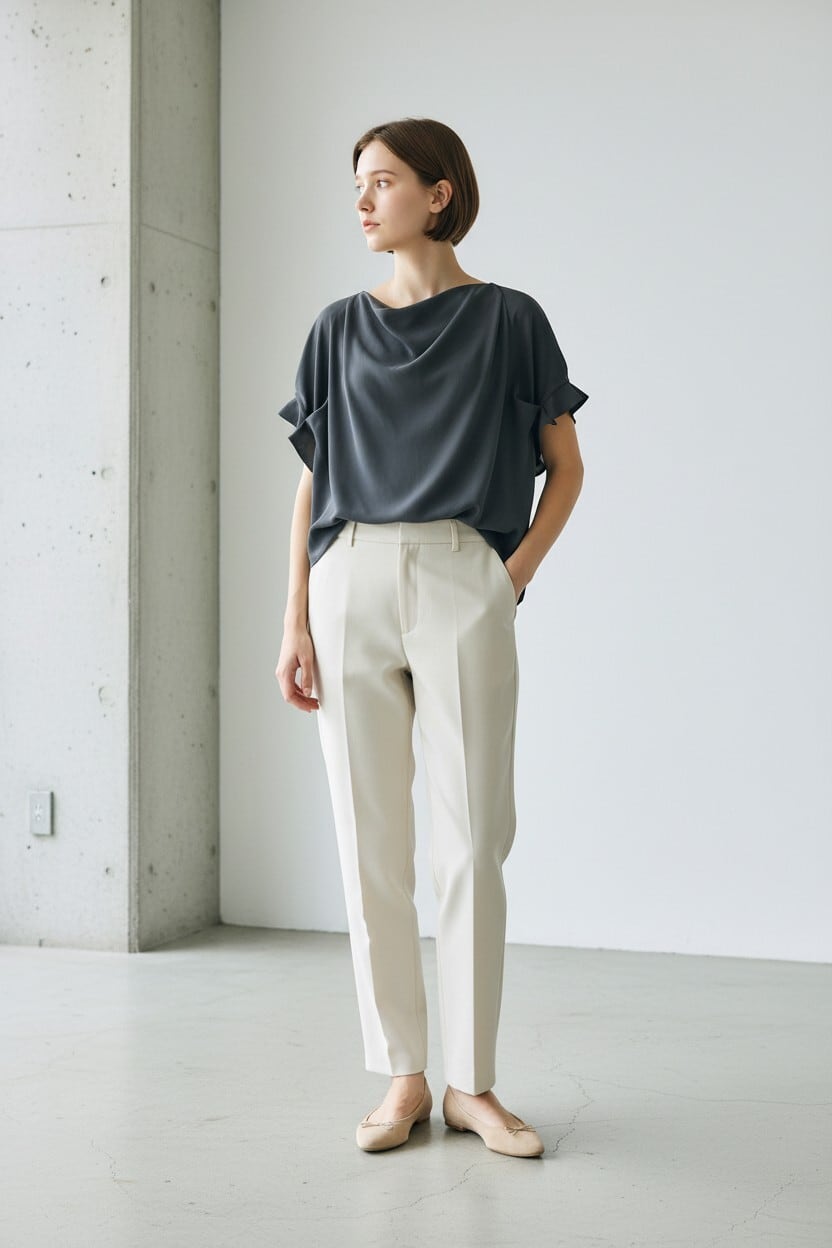 首元には美しいドレープが生まれ、柔らかく女性らしい印象を演出します。