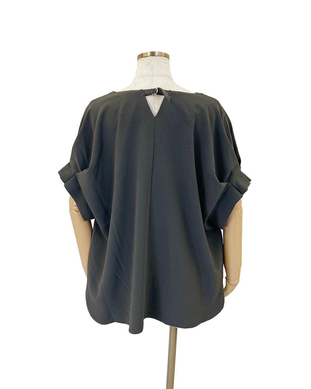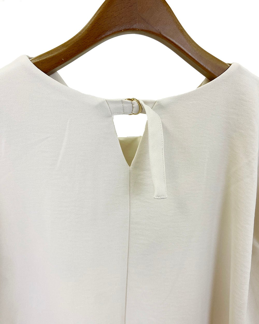後ろ首元はVネックデザインにD管ベルトをあしらい、バックスタイルにもアクセントをプラス。