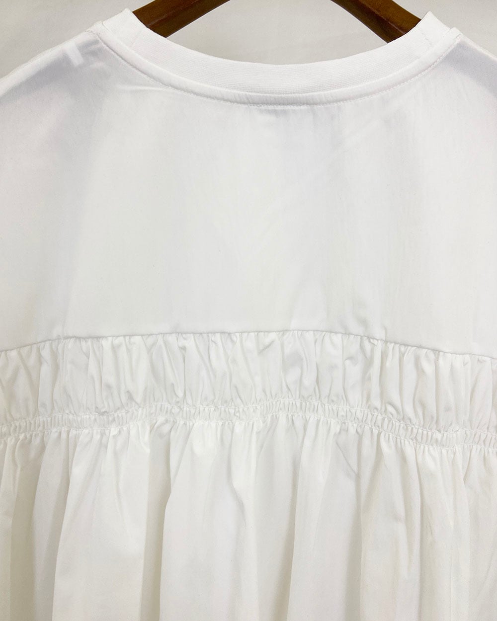 バックはハリ感のあるナイロン混の布帛を使用し、ヨーク部分に2本のゴムシャーリングを施すことで、立体的で美しいギャザーを生み出します。