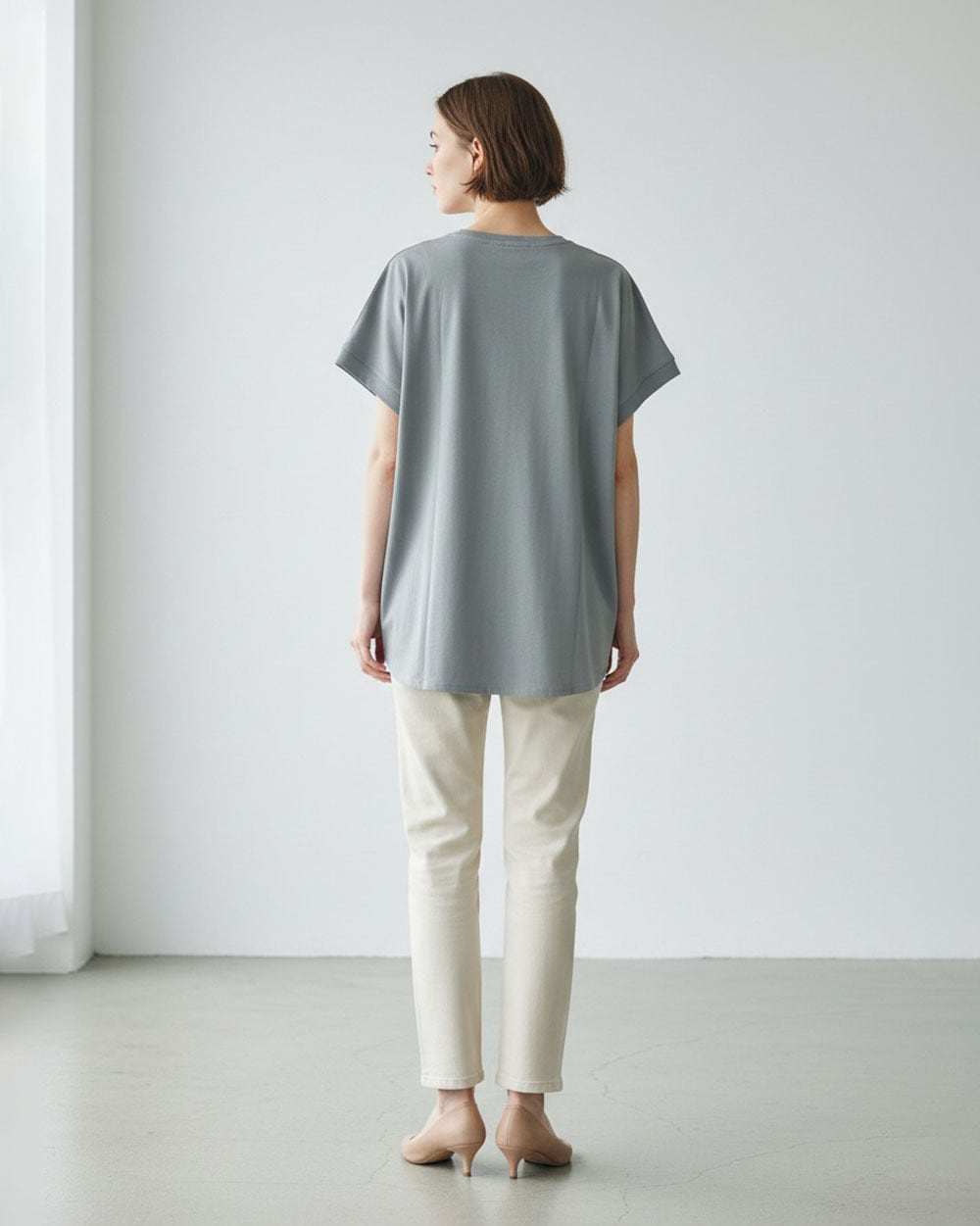 裾はラウンドヘムで前後差をつけ、こなれた雰囲気に仕上げました。