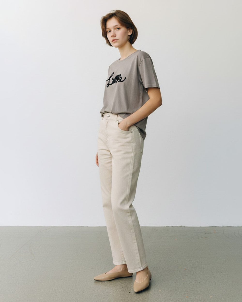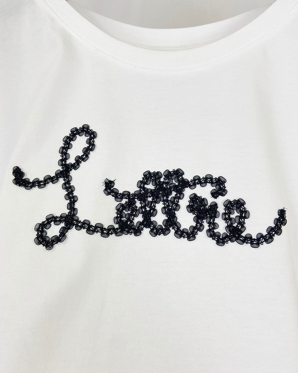 フロントにはファンシーヤーンを使ったコード刺繍を施し、立体感と華やかさをプラスしました。繊細で表情豊かな刺繍がポイント。ベーシックなシルエットで着回し力抜群、一枚でサマになるデイリーに活躍するアイテムです。
