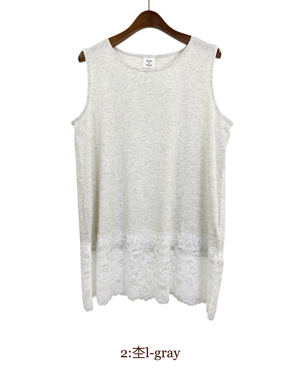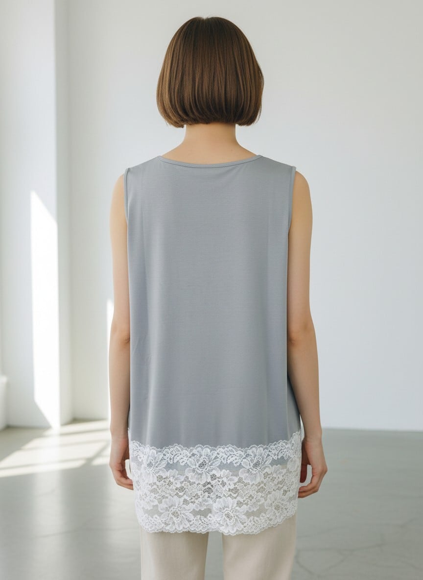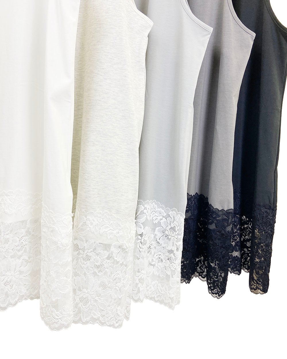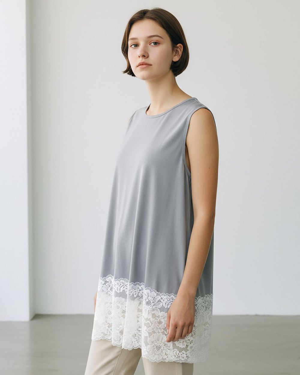 裾に繊細なレースをあしらった、チュニック丈のタンクトップ。