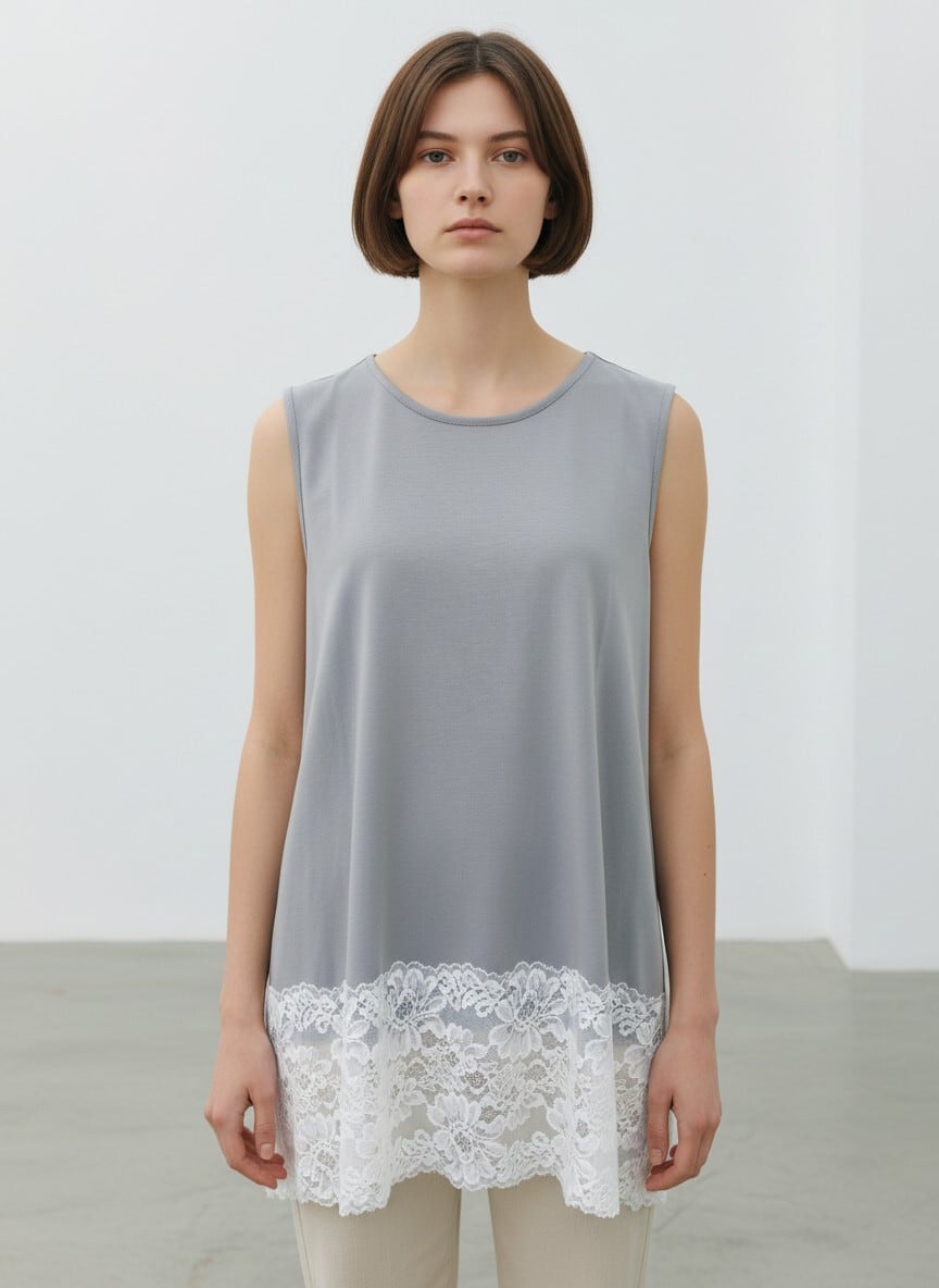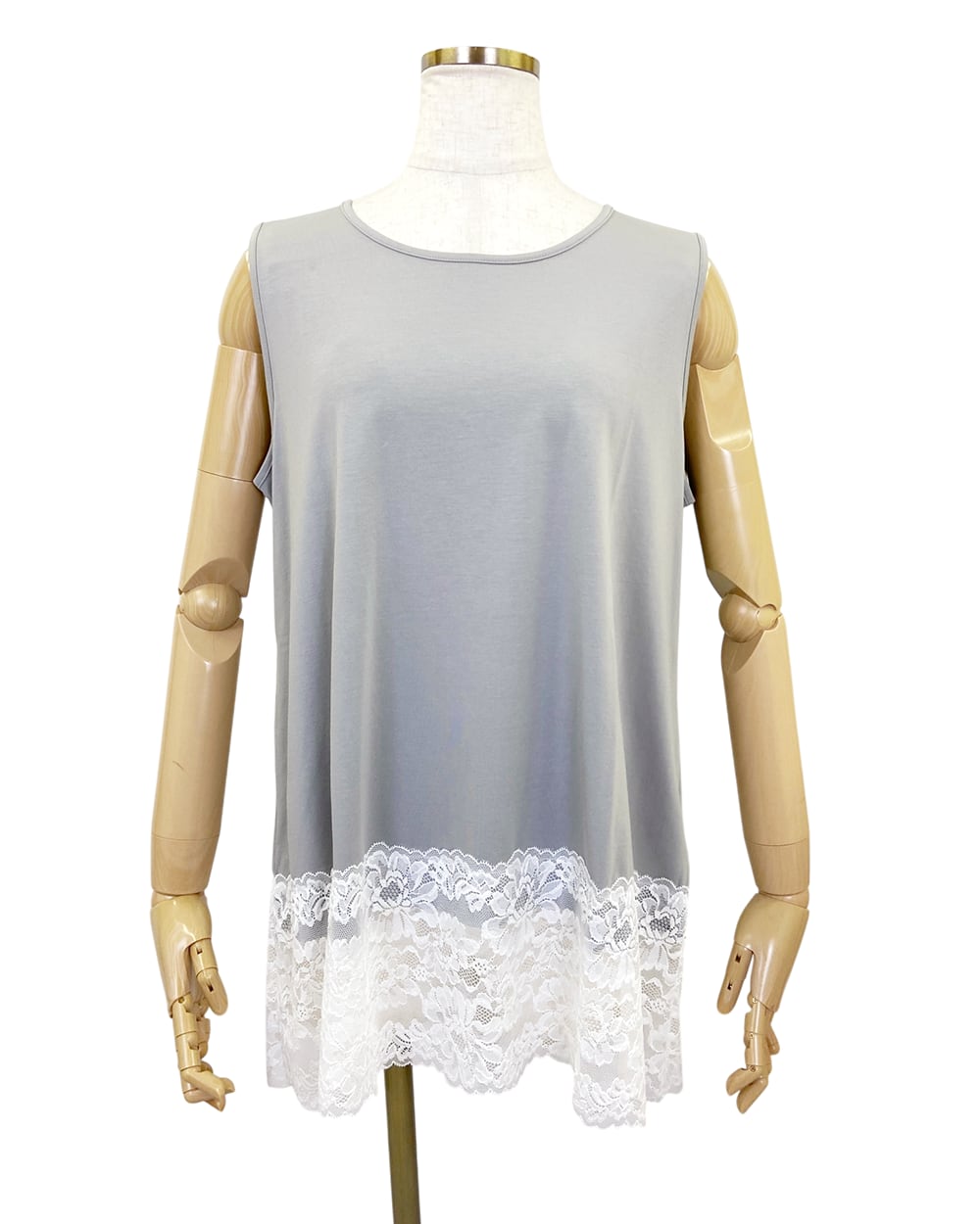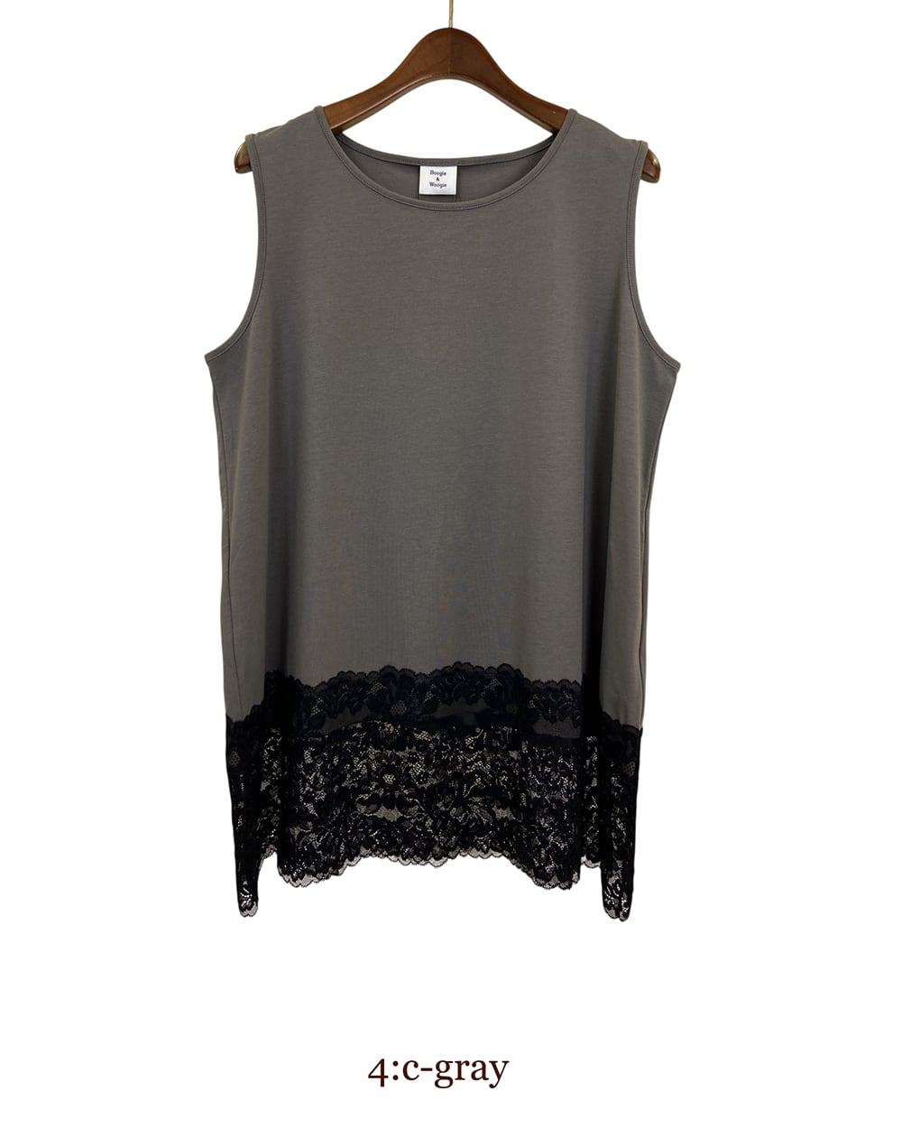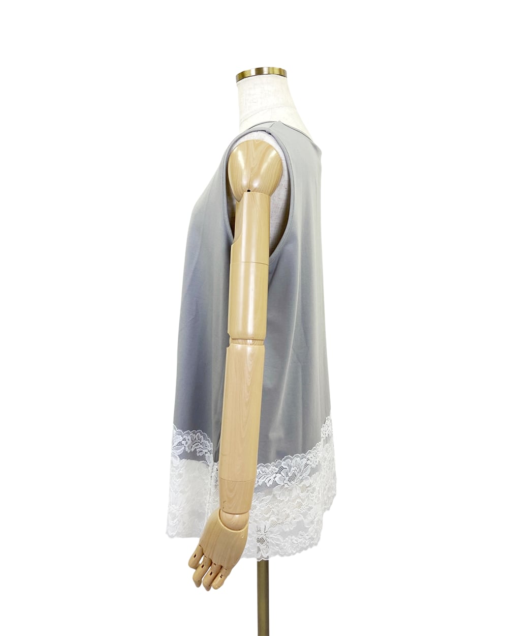 裾に繊細なレースをあしらった、チュニック丈のタンクトップ。