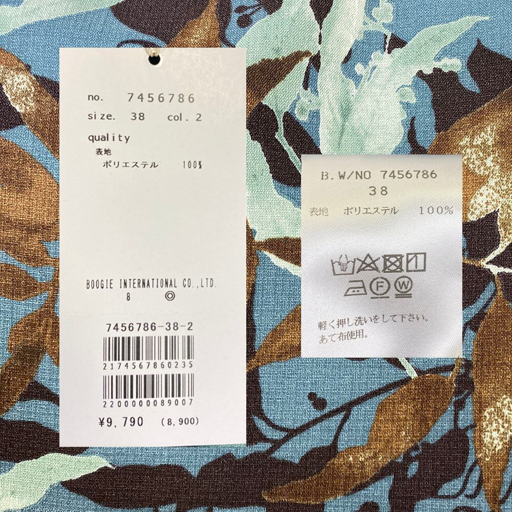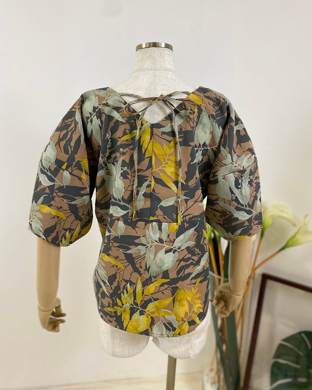 落ち着いたカラーのボタニカルプリントのプルオーバーブラウス。